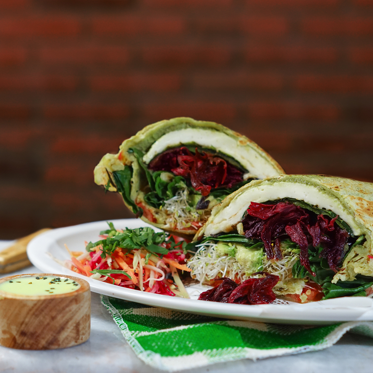 Relleno de flor de jamaica al vino tito, queso panela, aguacate, jitomate y nuestra preparación especial de requeson con chile poblano asado, acelga y germen de alfalfa. Guarnición de julianas chayote, zanahoria, betabel y calabaza Acompañado con aderezo de yogurt al curry y ajonjolí negro.