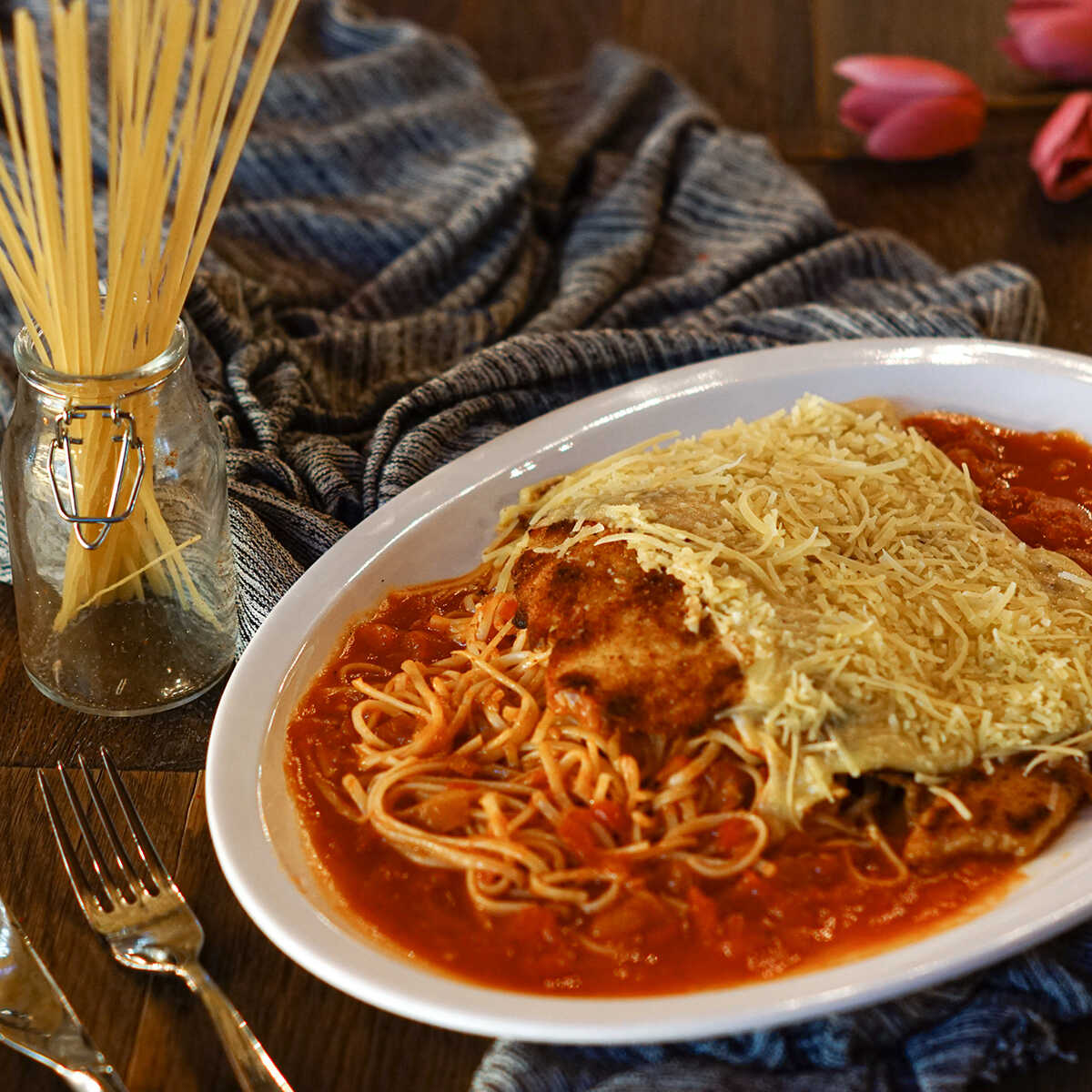 Jugosa milanesa de pollo gratinada sobre una cama de linguini al pomodoro.