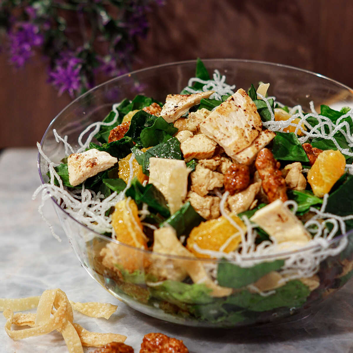 Mezcla de lechugas, espinacas, pollo, suprema de mandarina, nuez garapiñada, lluvia de primavera y wonton; con aderezo de cacahuate. ¡Naturalmente oriental!