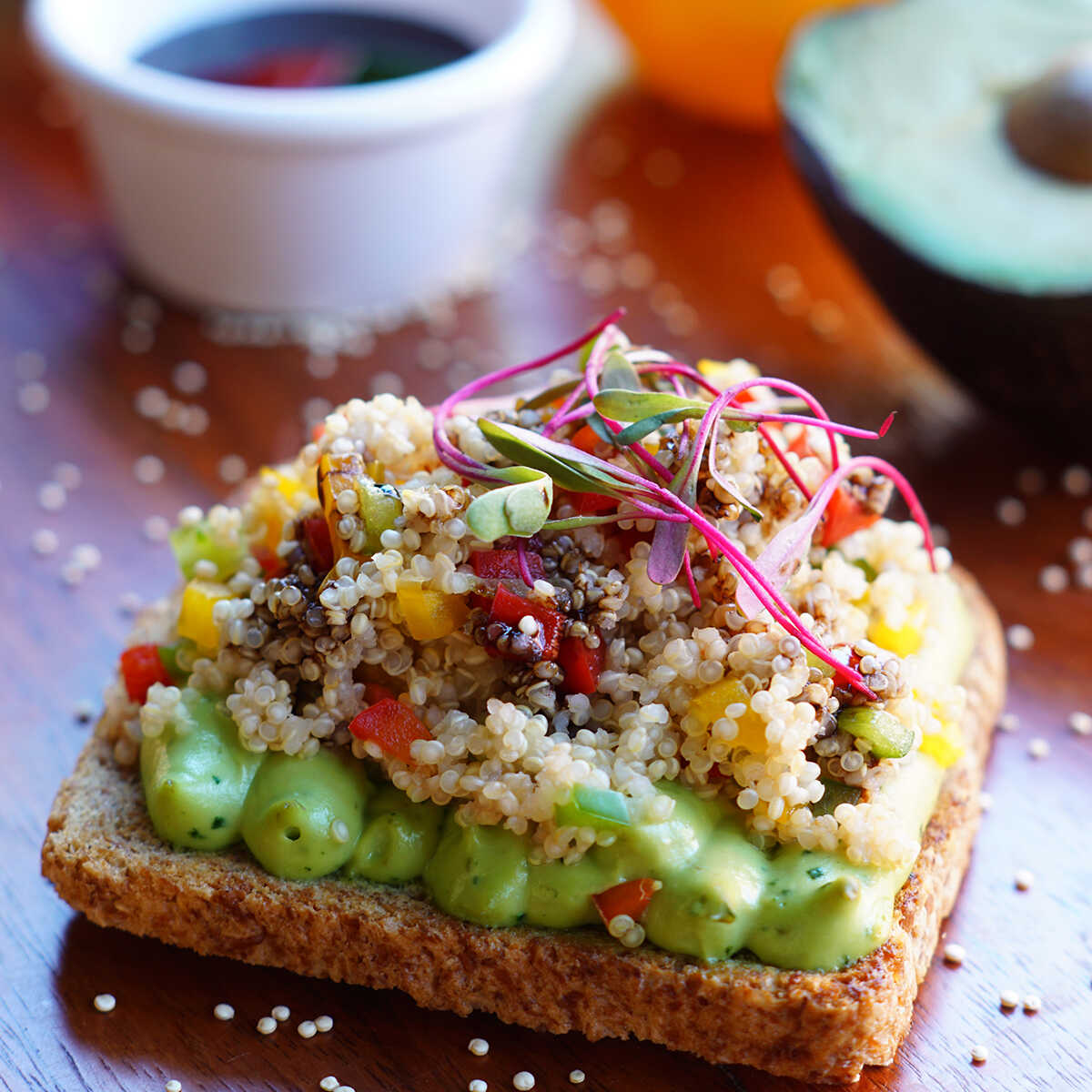 PAN EZEQUIEL ,AGUACATE ,QUINOA,MEZCLA DE PIMIENTOS ,BROTES DE BETABEL,CILANTRO Y MAIZ