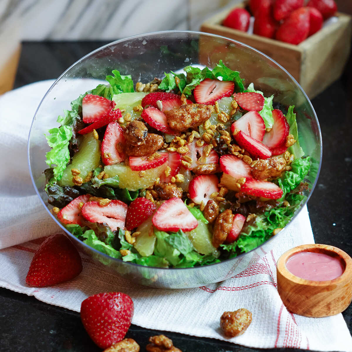 Selección de lechugas con rebanadas de fresa, suprema de naranja, semilla de girasol y nuez garapiñada; con aderezo de fresa.