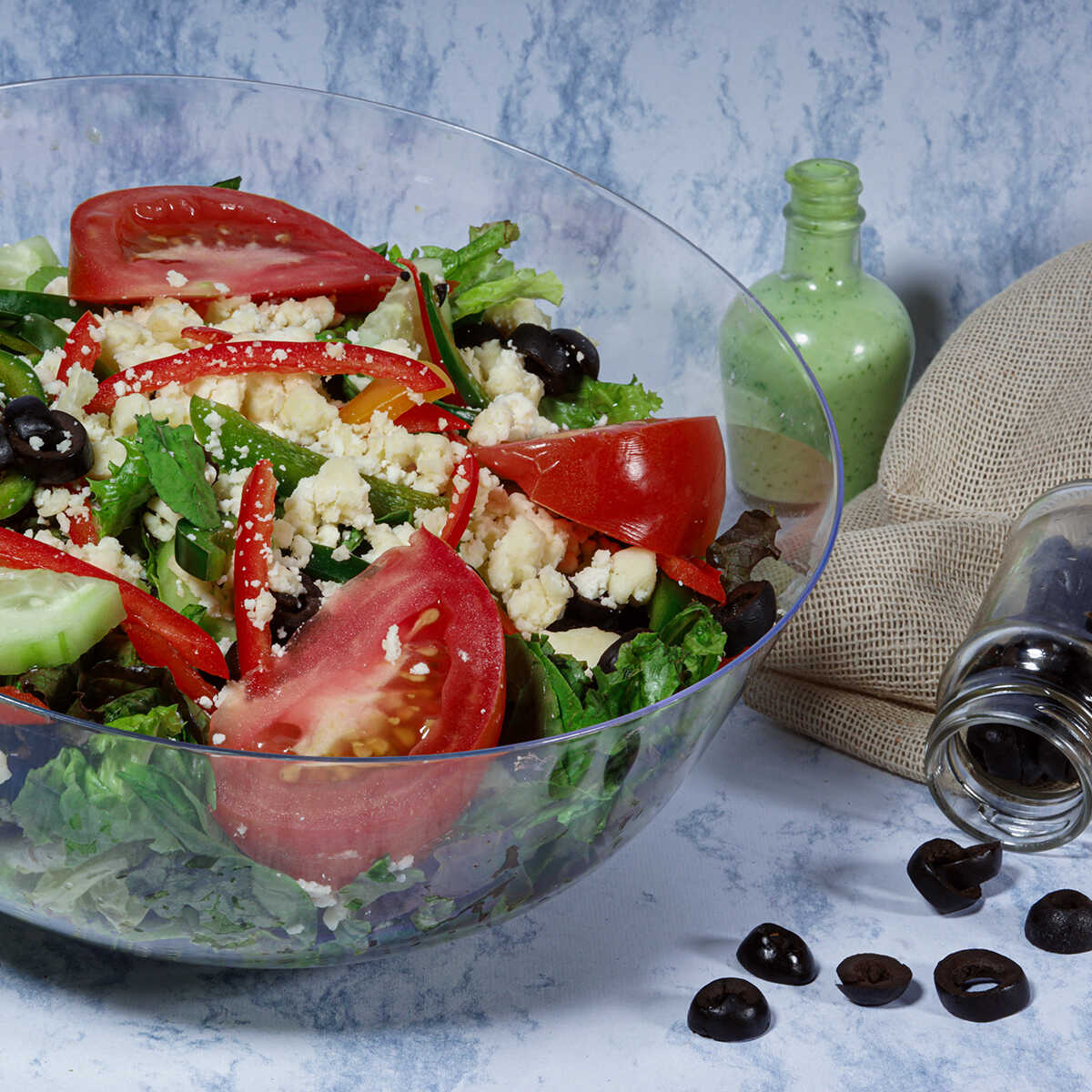 Mezcla de lechugas, arúgula, jitomate, aceitunas negras, pepino, pimientos y queso feta; con aderezo de albahaca.