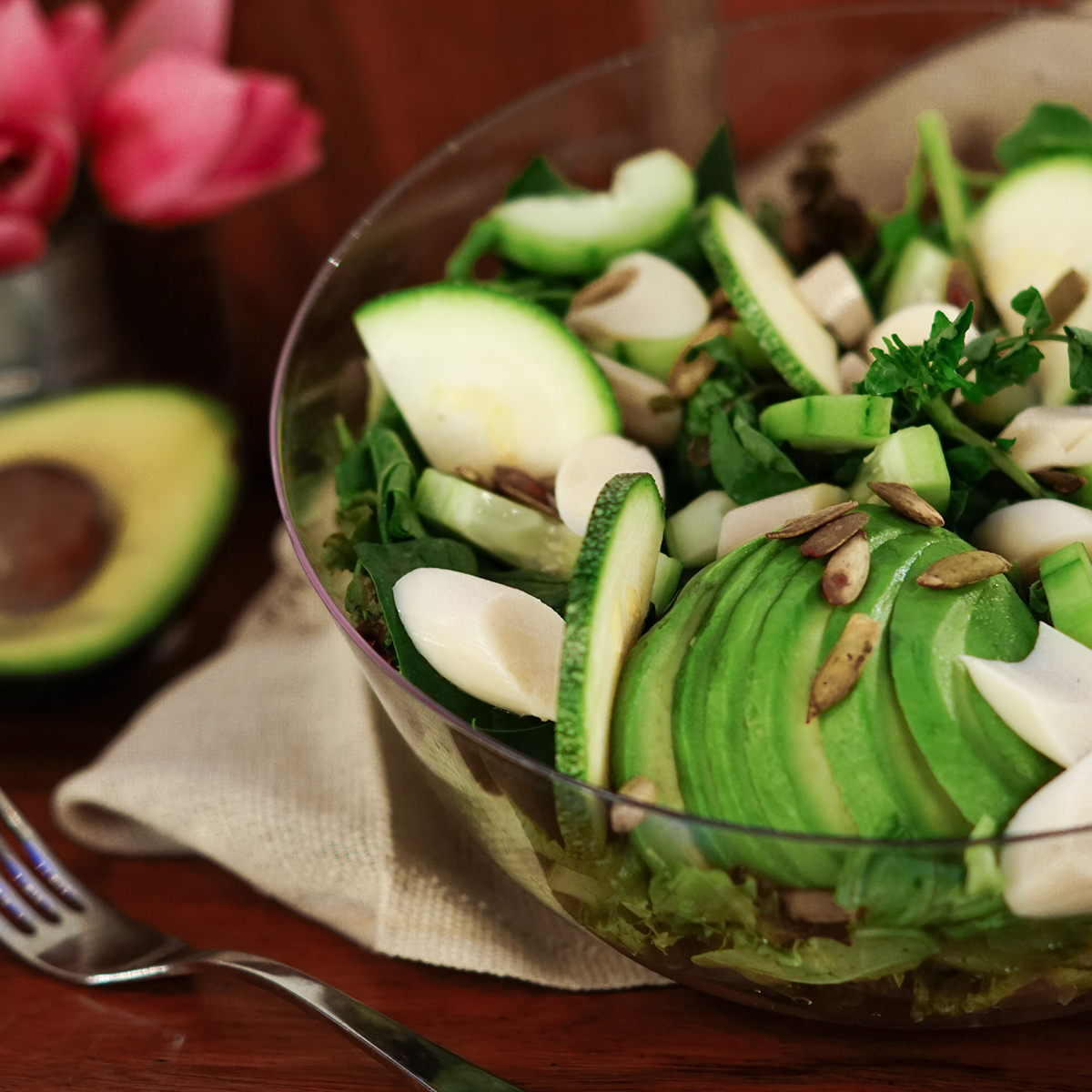 Mezcla de lechugas, arúgula, berros, espinacas, aguacate, pepino, calabacita, pepita verde y palmitos; con aderezo de yogurt con aguacate. ¡Puro hierro!