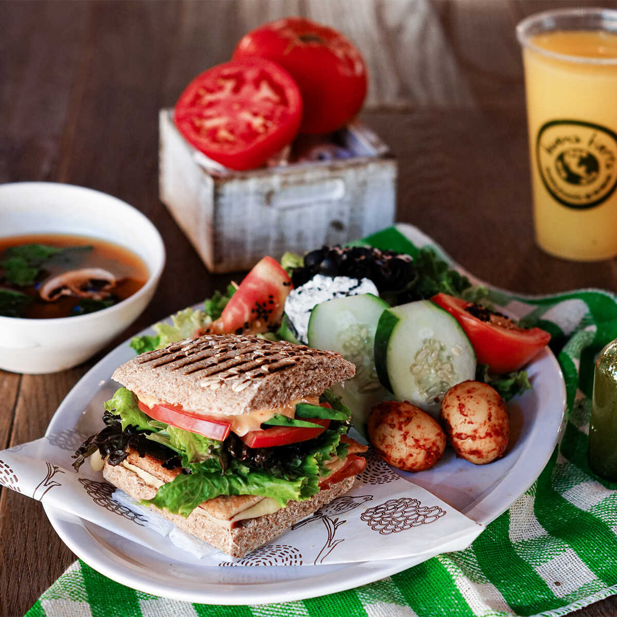 Medio Panini clásico, media ensalada popeye y un agua fresca (500 ml) de tu elección: Melón, mango, Jamaica, fresa, piña, papaya, sandía, limoncito, limón con chía y o piña con perejil.