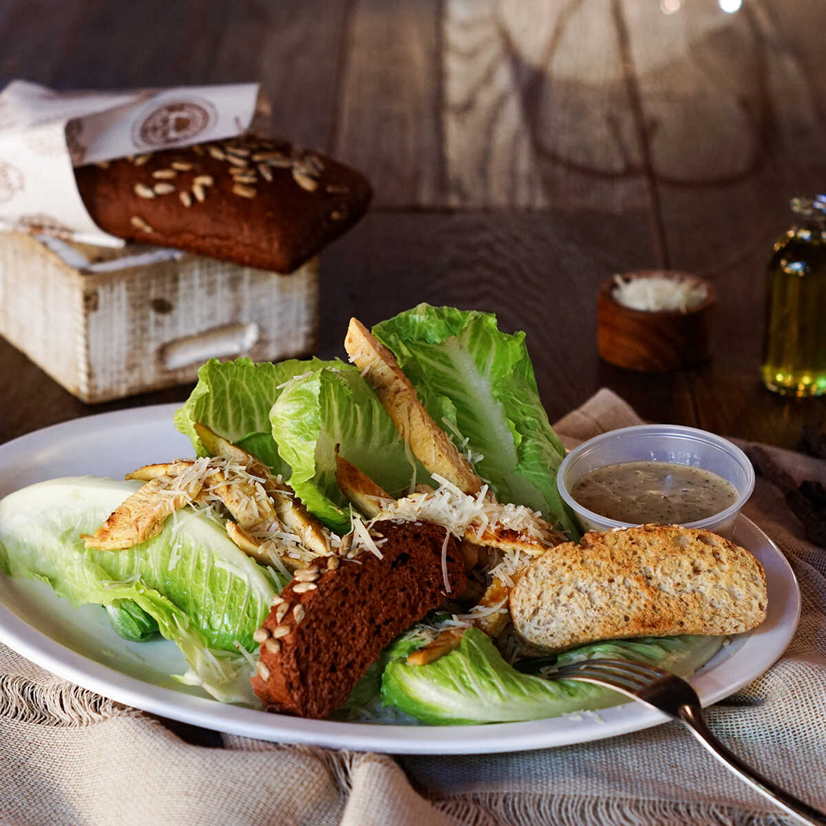La clásica con queso parmesano, croutones integrales, pollo y aderezo de anchoas.