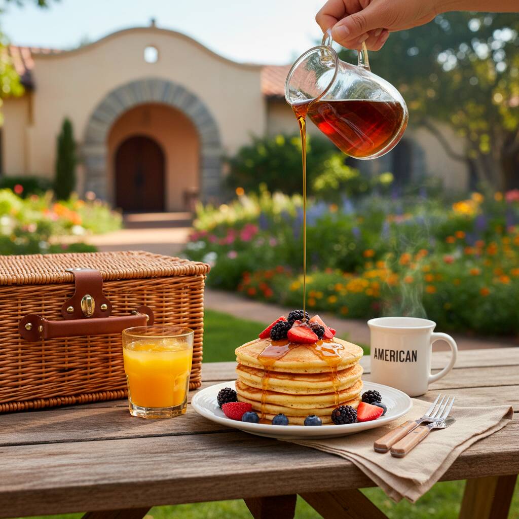 Hot cakes con harina de trigo y zarzamora. Con jugo de naranja (355 ml) o fruta, café americano o té (355 ml).