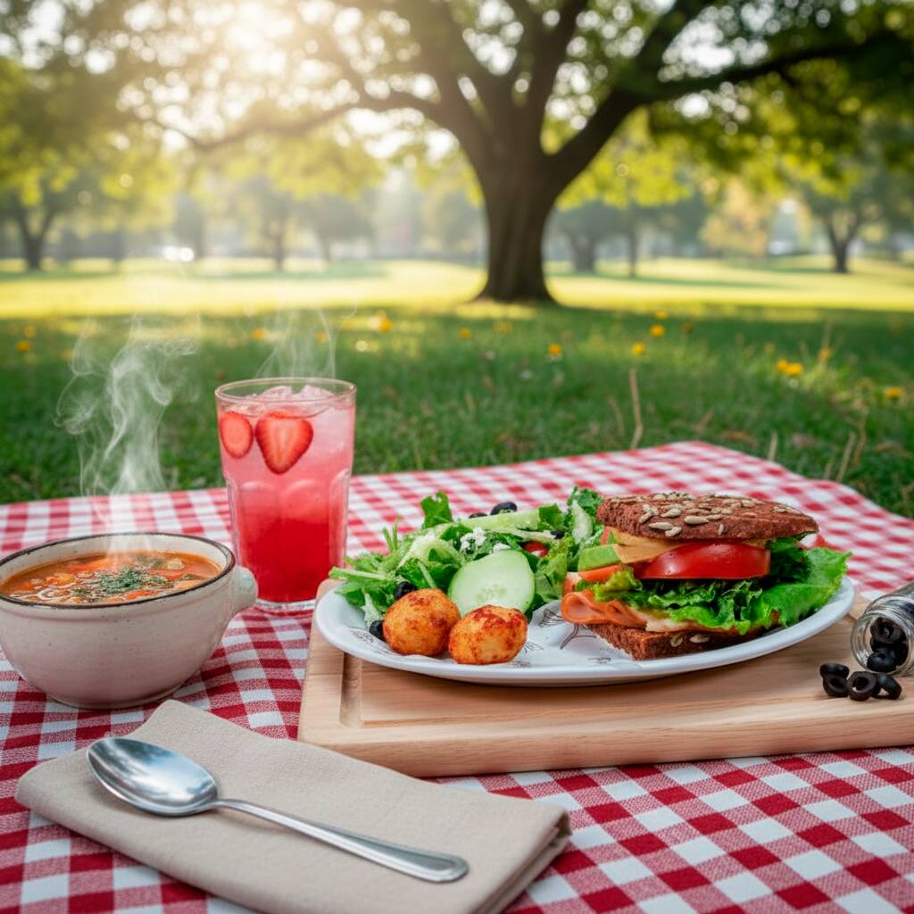 Una pita de jamón de pavo y queso, media ensalada césar con pollo, sopa y un agua fresca (500ml) de tu elección: Melón, mango, Jamaica, fresa, piña, papaya, sandía, limoncito, limón con chía y o piña con perejil.