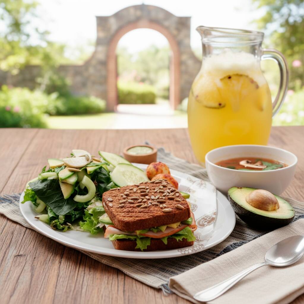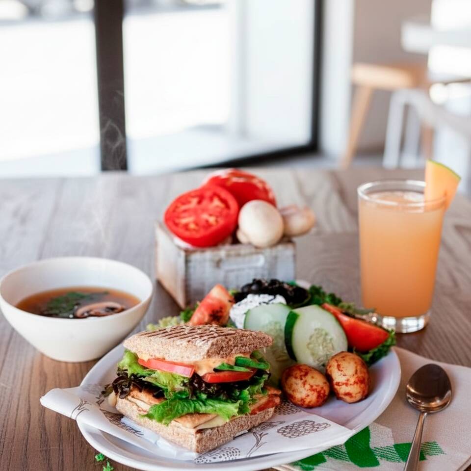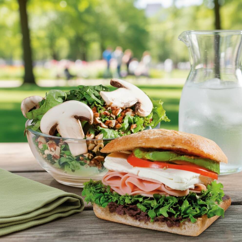 Medio Sándwich clásico, media ensalada todo verde y un agua fresca (500ml) de tu elección: Melón, mango, Jamaica, fresa, piña, papaya, sandía, limoncito, limón con chía y o piña con perejil.