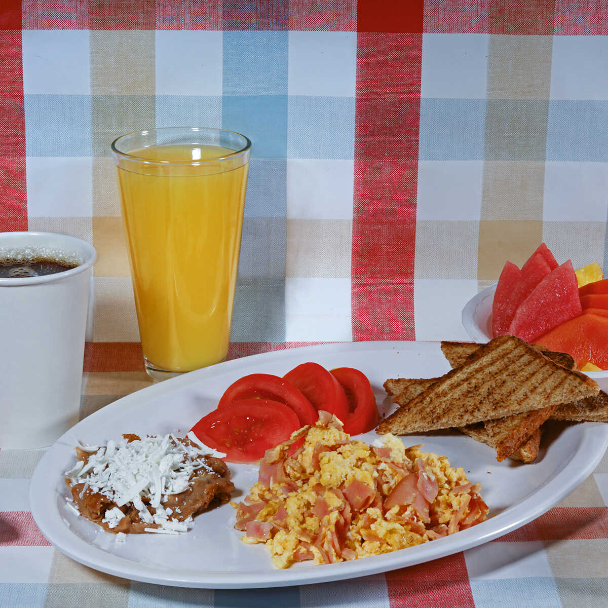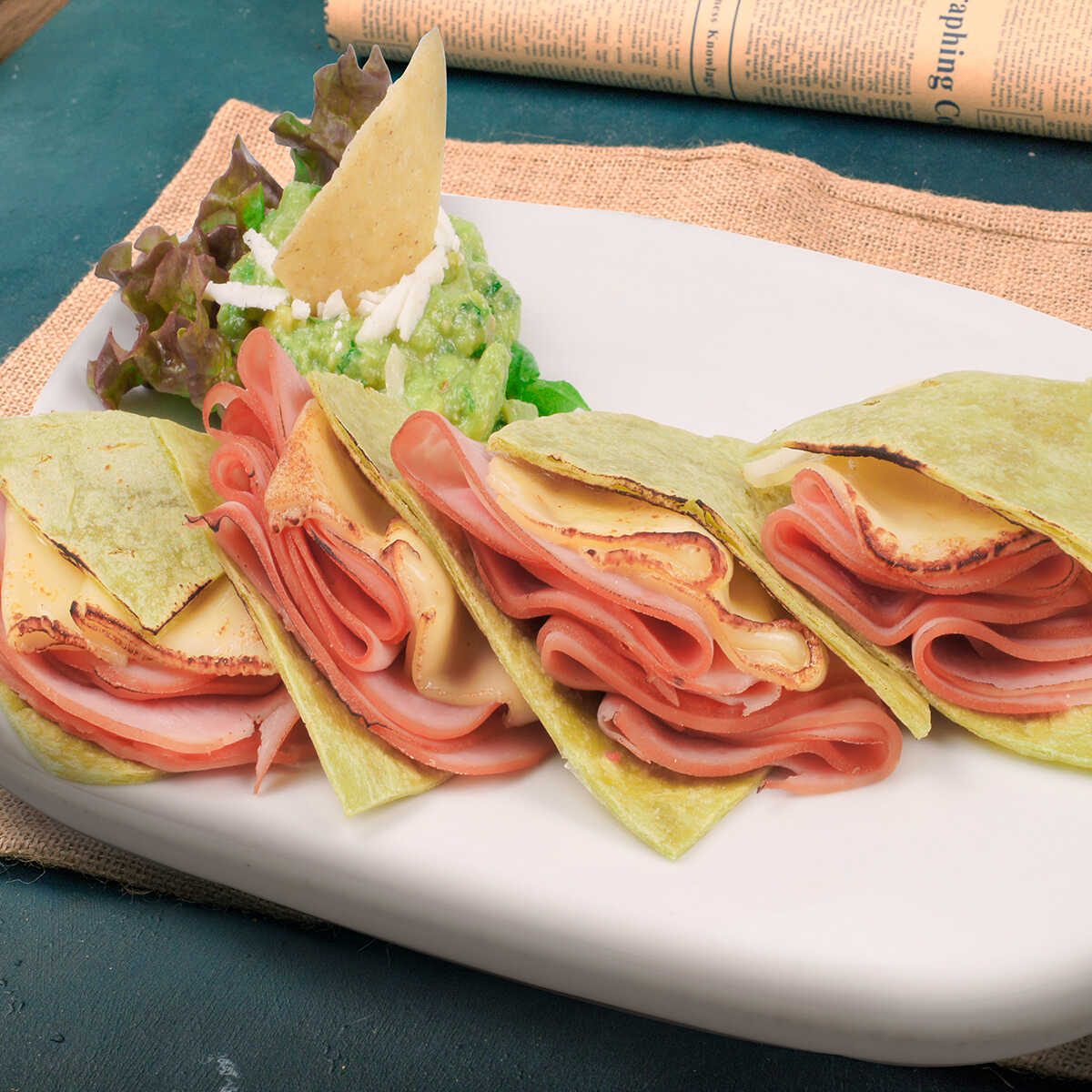 Queso Oaxaca, jamón de pavo, tocino y frijoles; acompañado con lechuga, guacamole y jitomate.