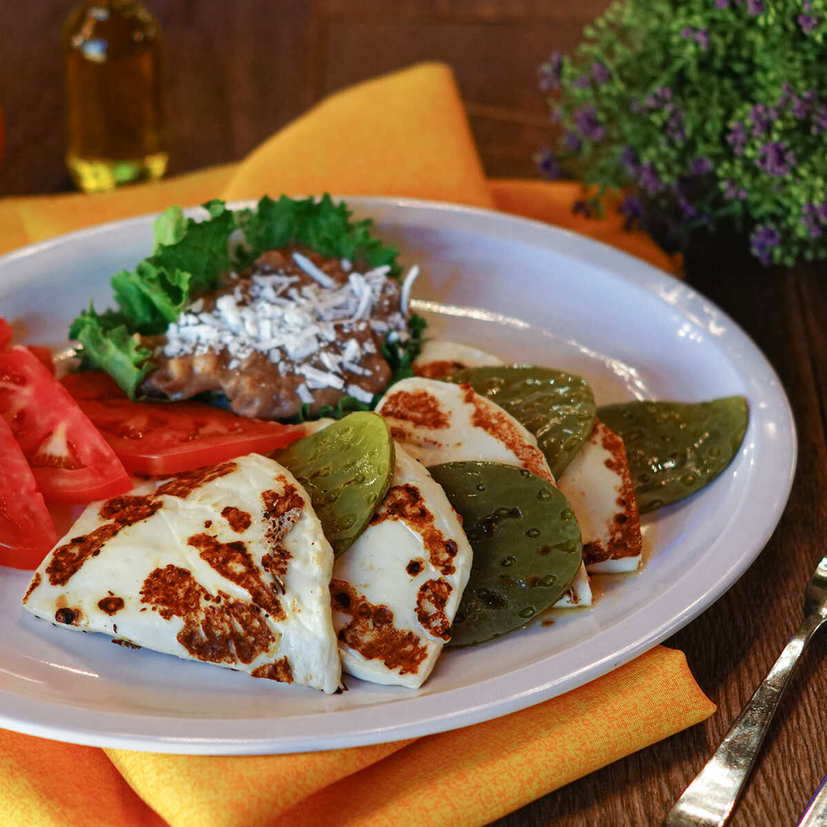 Queso panela asado al grill acompañado con nopales y frijoles.