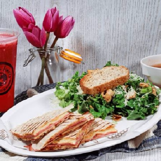 Una pita de jamón de pavo y queso, media ensalada césar con pollo, sopa y un agua fresca (500ml) de tu elección