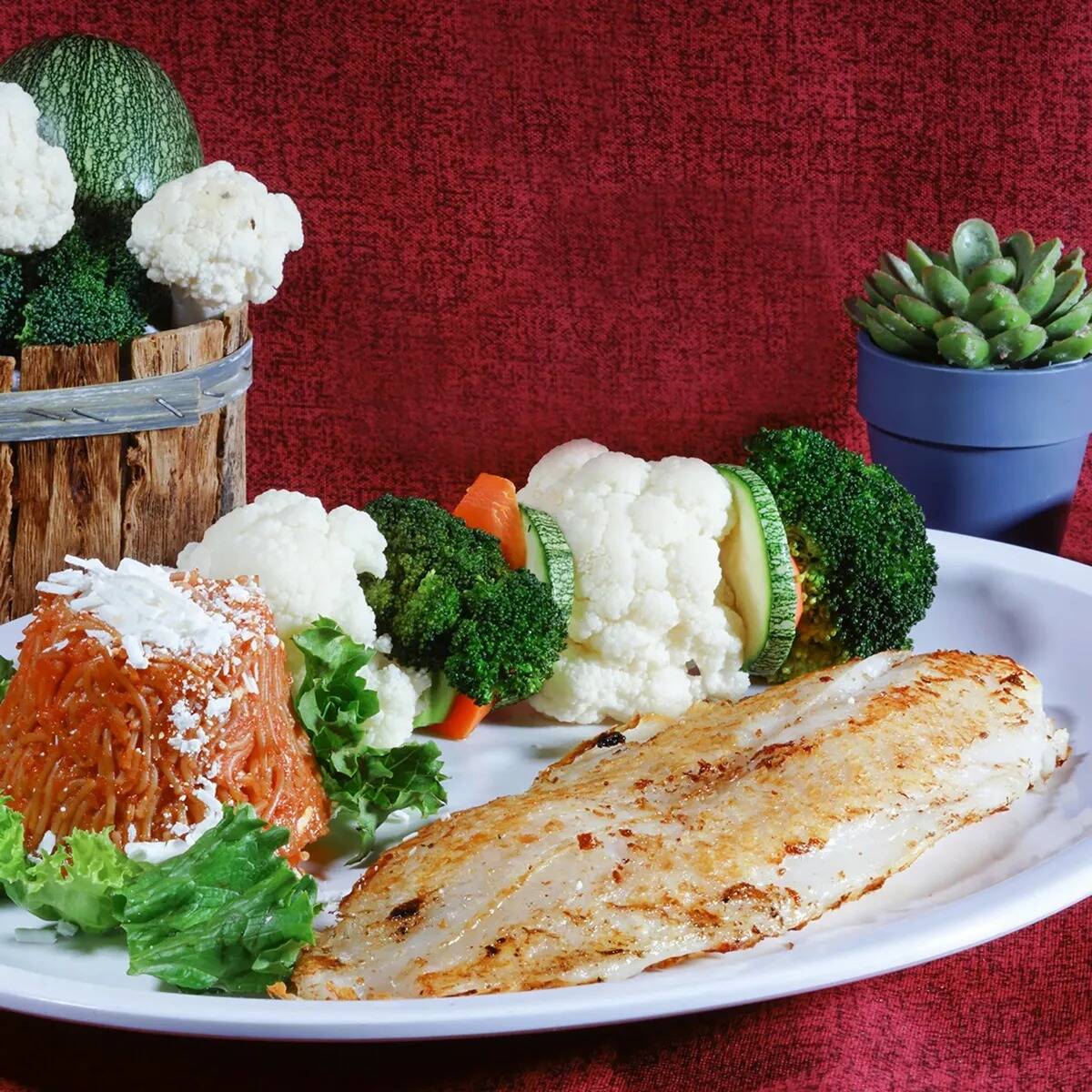 Filete de pescado a la plancha acompañado con fideo seco y verduras al vapor.