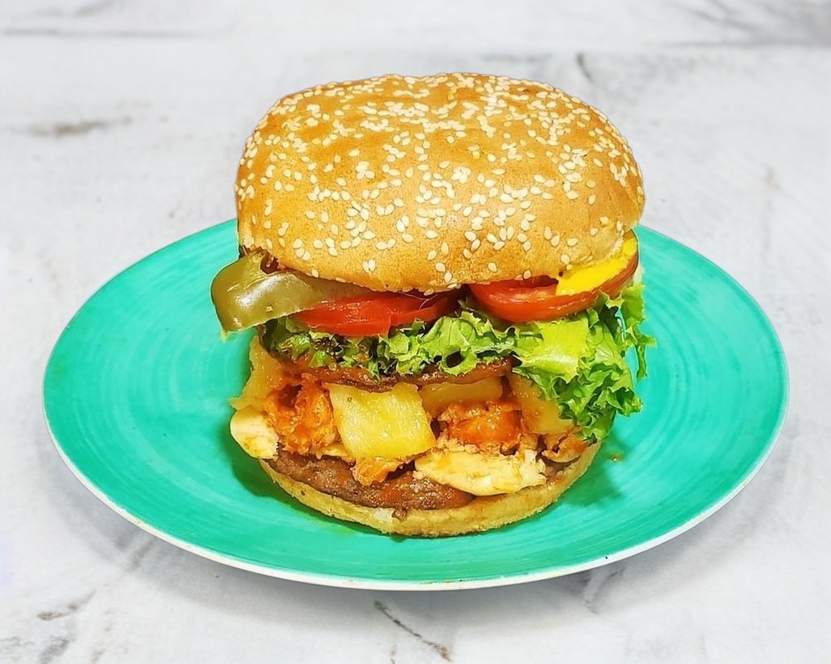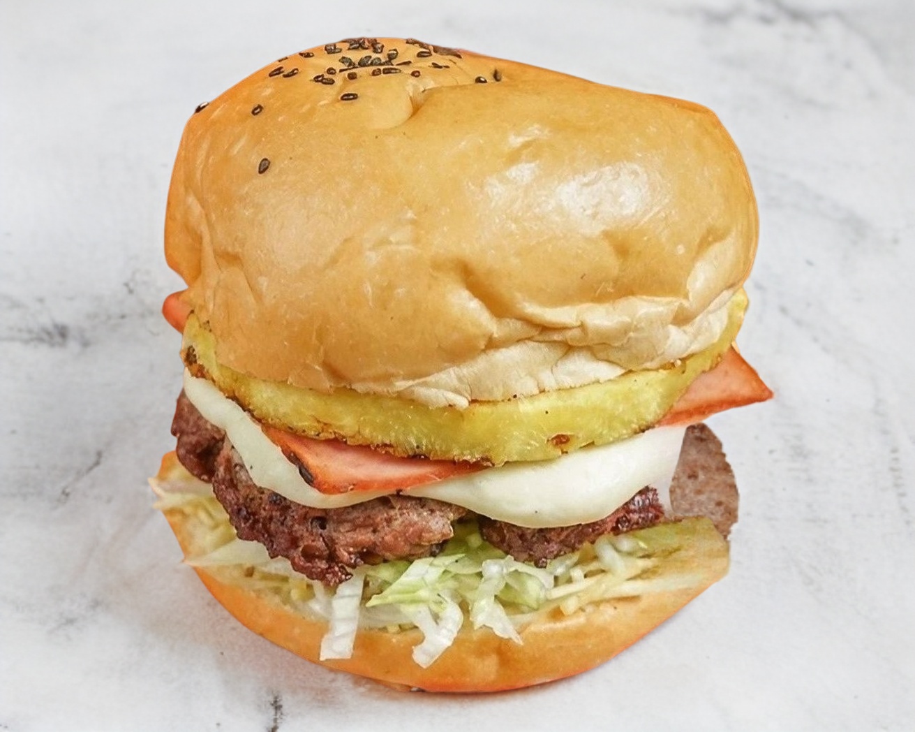 Hamburguesa de 2 Carnes (200 gramos) Doble queso, Jamón, Piña, en Pan con Mayonesa, Cátsup, Mostaza, Lechuga, Jitomate y Picante.