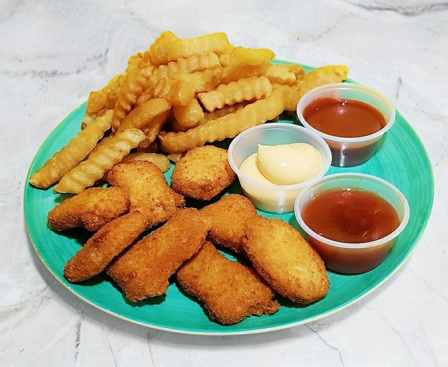 7 Nuggets con 200 Gramos de Papas a la Francesa. Incluye 2 Onzas de Queso Liquido.
