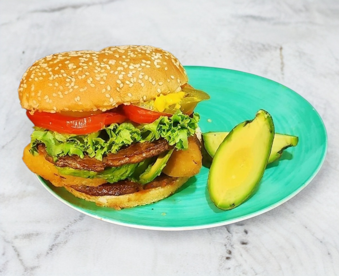 Hamburguesa de 2 carnes (200 gramos), 2 crujientes jalapeños, rellenos de queso philadelphia y aguacate.