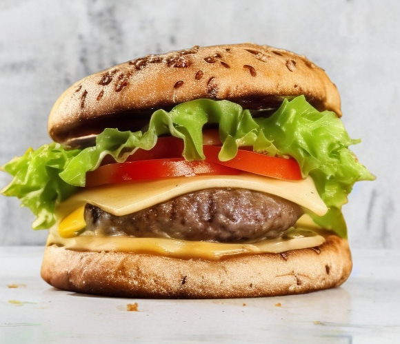Hamburguesa de 3 Carnes (300 gramos), Doble Queso (60 gramos), en Pan con Mayonesa, Cátsup, Mostaza, Lechuga, Jitomate y Picante.