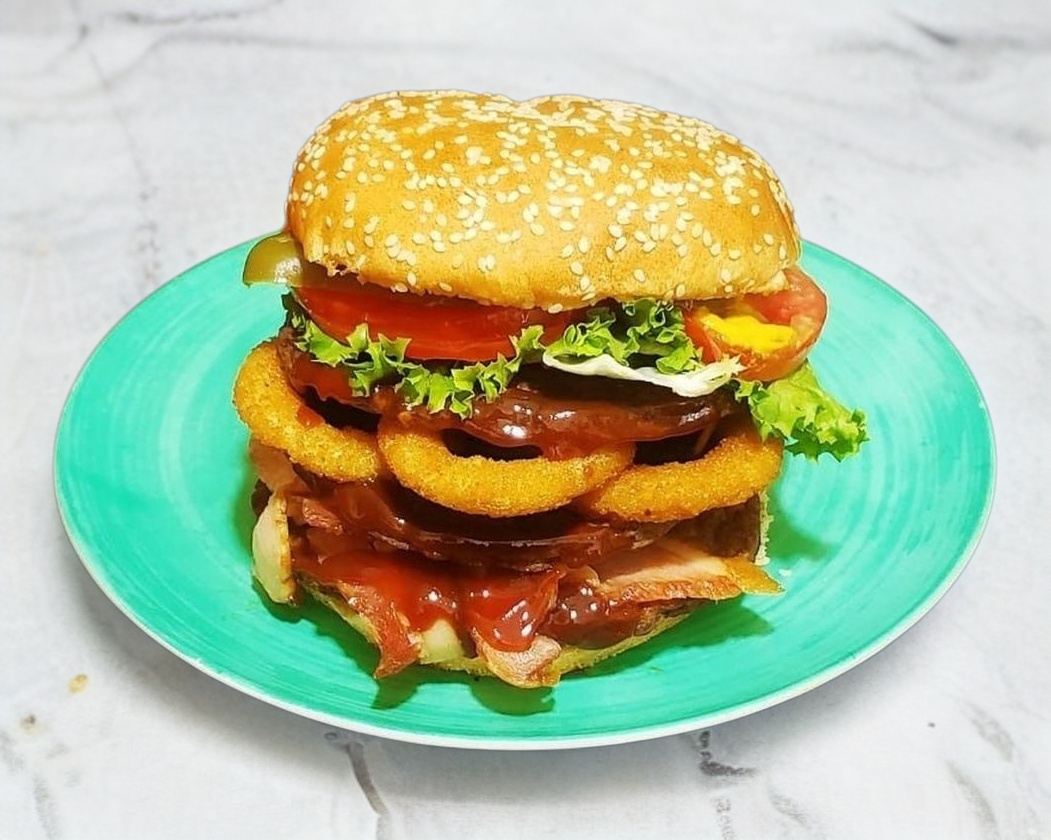 Preparada con 3 carnes (300 gramos), salsa bbq, 3 crujientes aros de cebolla y tocino.
