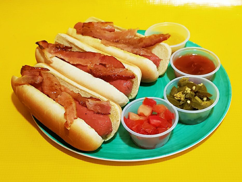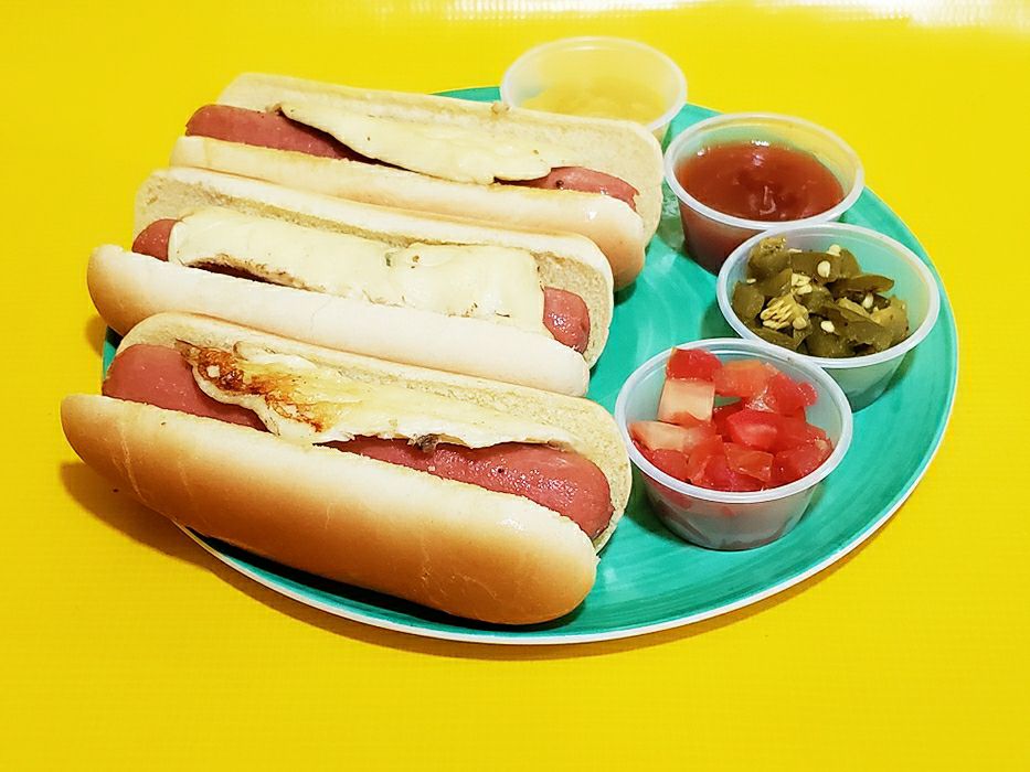 3 Hot Dogs de Salchicha de Pavo, en Pan con Mayonesa, Catsup, Mostaza, Jitomate y Picante.