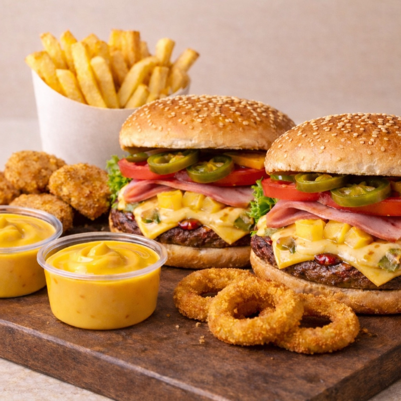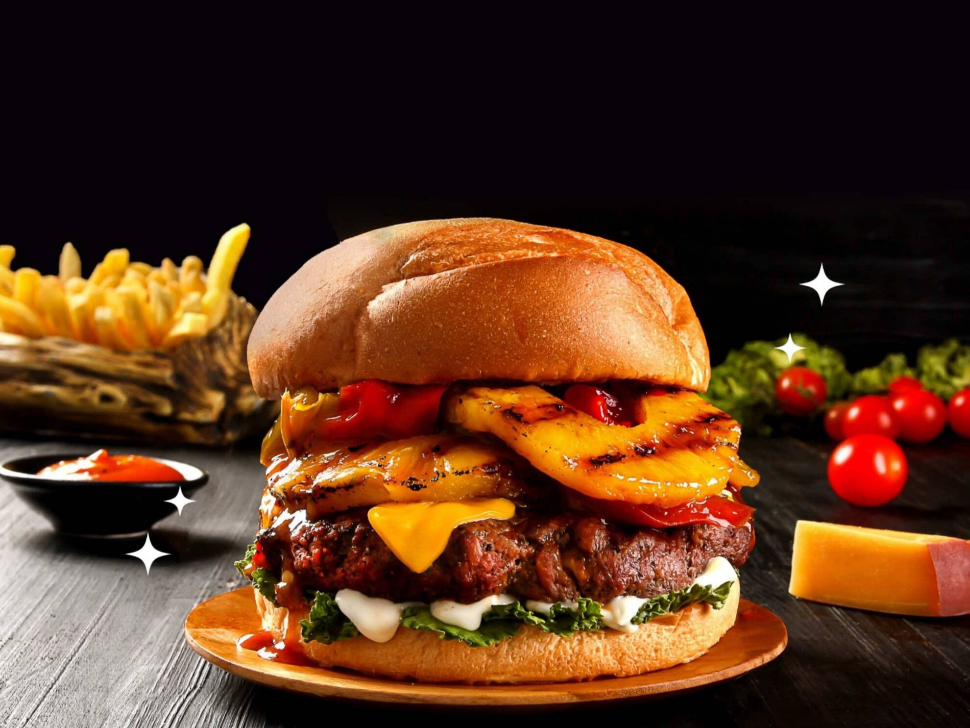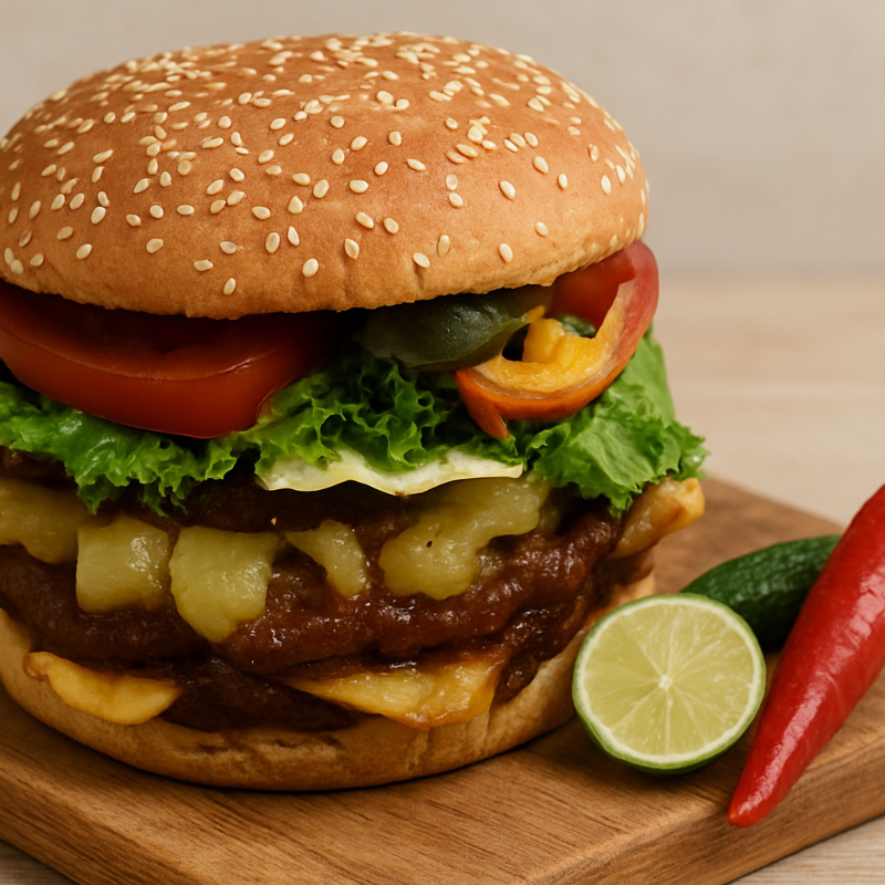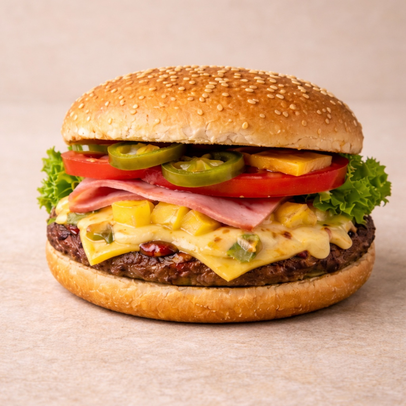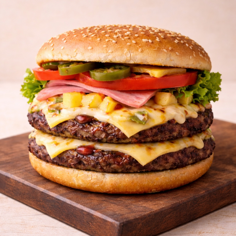 Hamburguesa de 2 Carnes (200 gramos) Doble queso, Jamón, Piña, en Pan con Mayonesa, Cátsup, Mostaza, Lechuga, Jitomate y Picante.