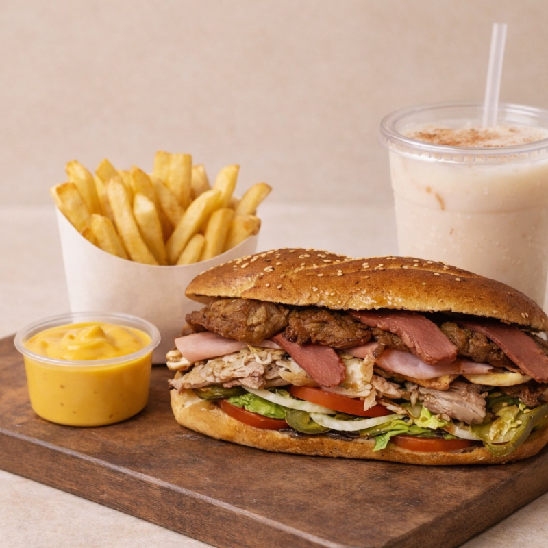 Preparada con 2 porciones de pollo (120 gramos), carne al pastor, piña y quesillo , en pan con mayonesa, mostaza, catsup, lechuga, jitomate y picante.