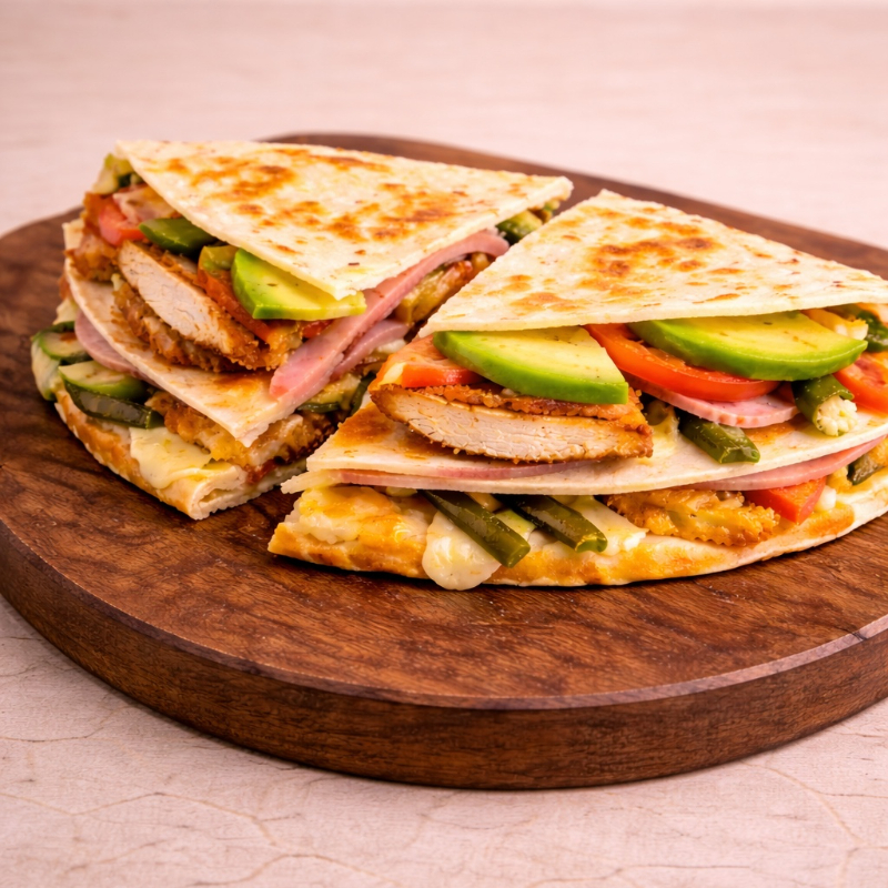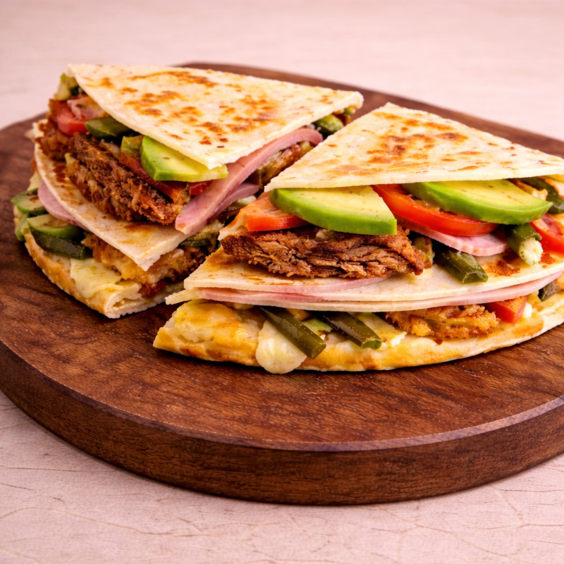 Doble tortilla de harina, jamón, 2 quesos, rajas, jitomate y aguacate.