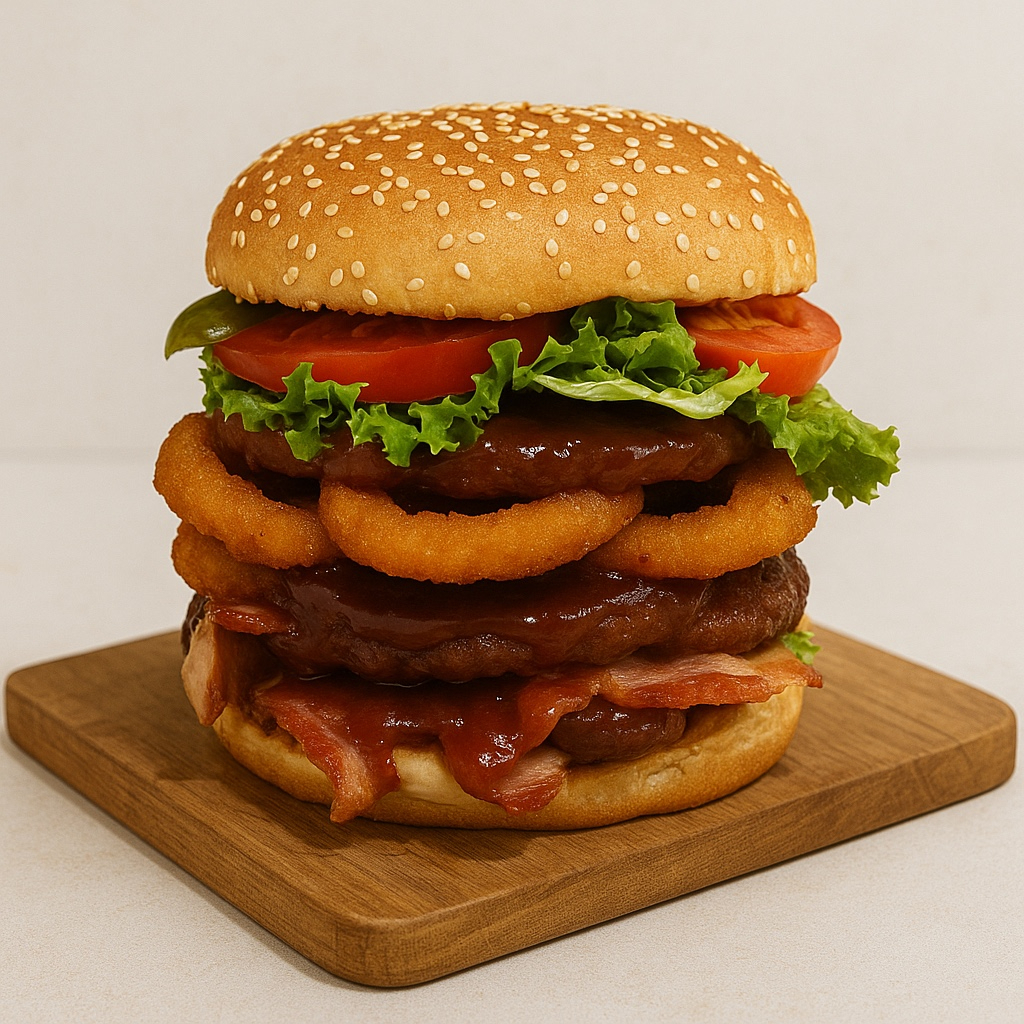Preparada con 3 carnes (300 gramos), salsa bbq, 3 crujientes aros de cebolla y tocino.