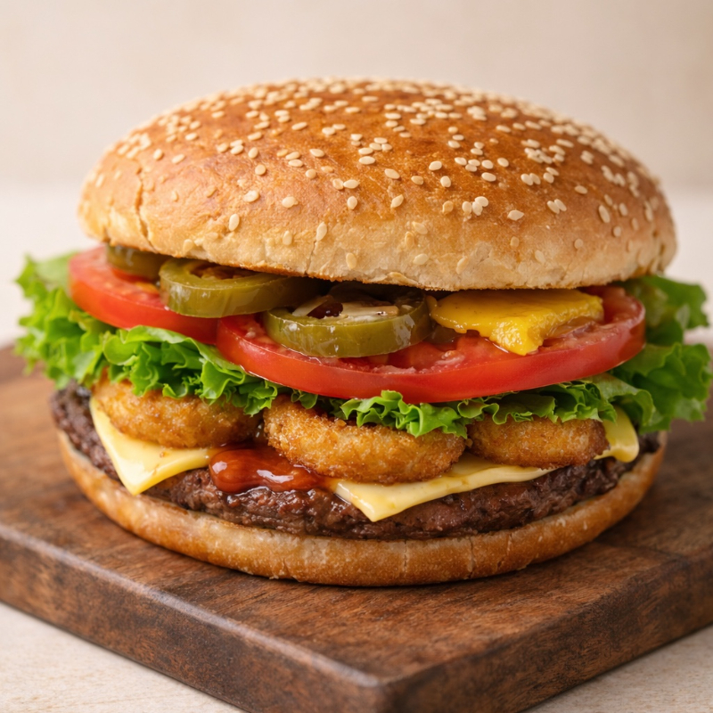 Hamburguesa, preparada con 2 carnes (200 gramos), 3 crujientes aros de cebolla y cebolla sazonada.