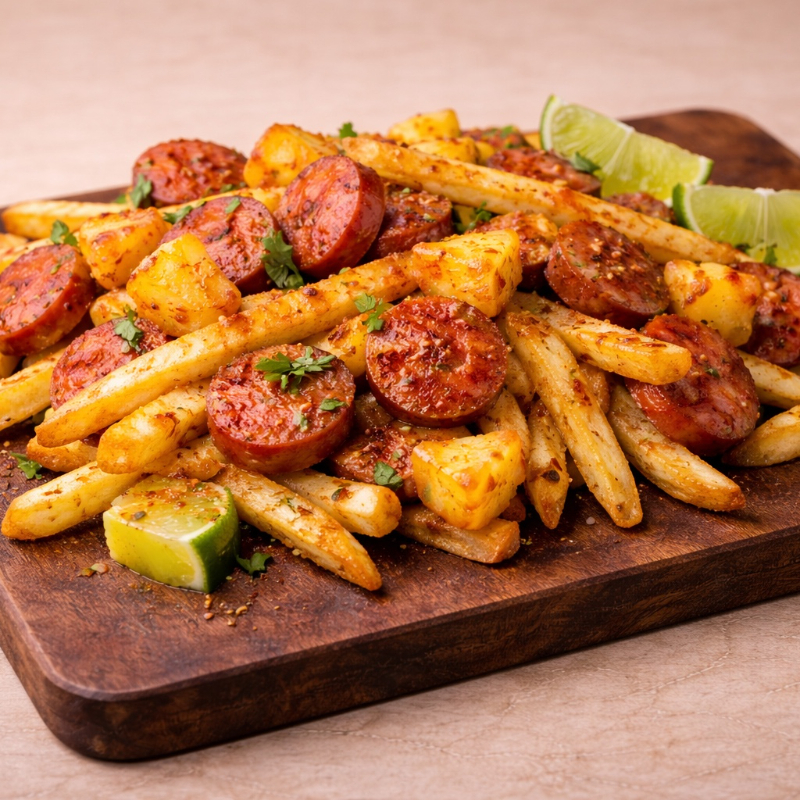 Papas a la Francesa Acompañadas de Salchicha, Piña Limón y Tajin.