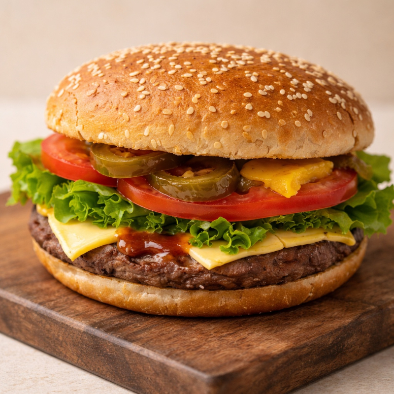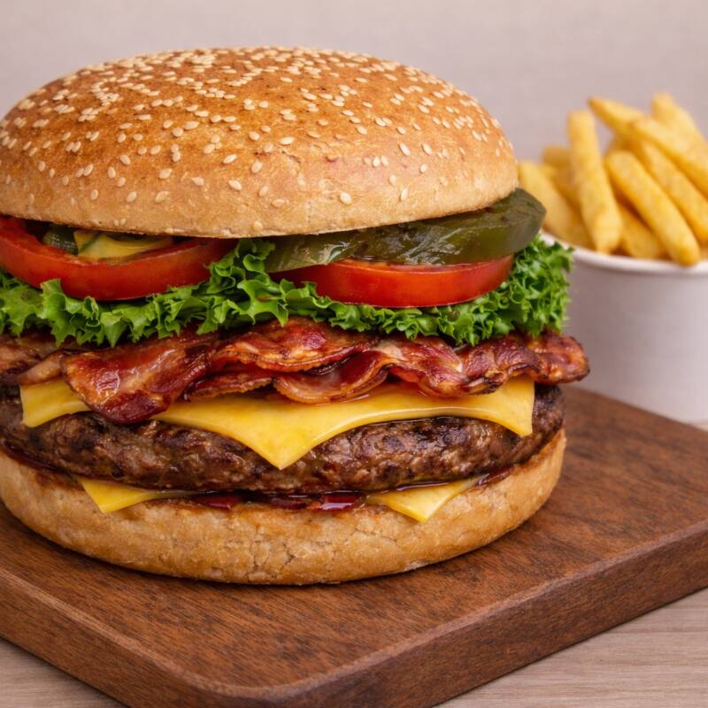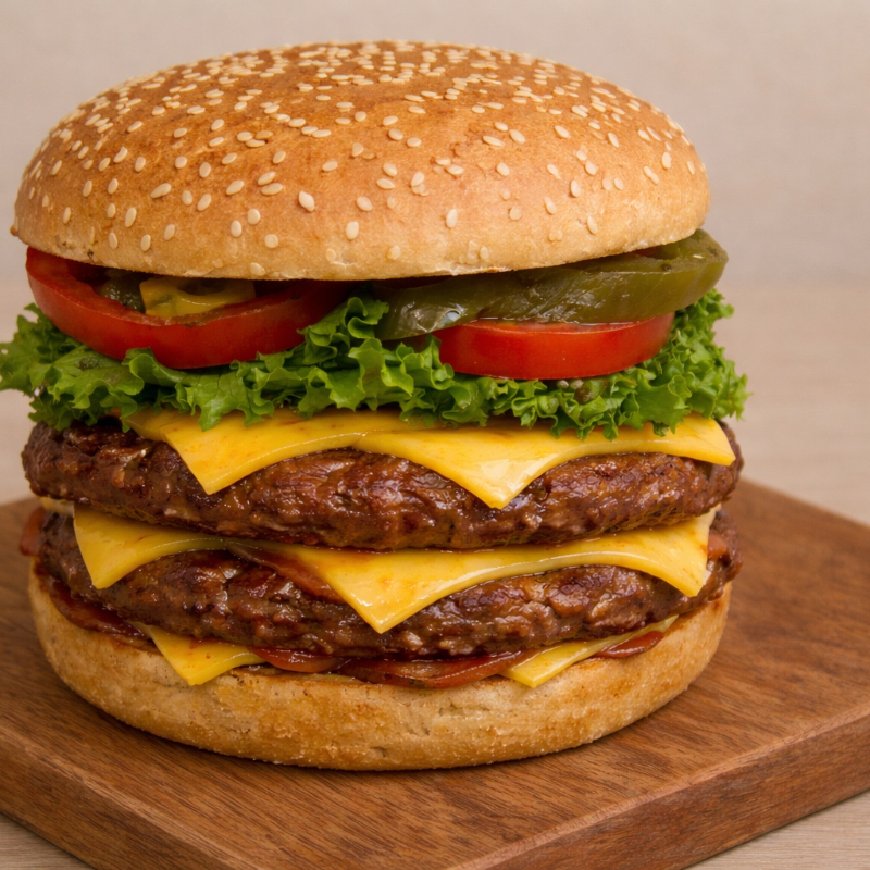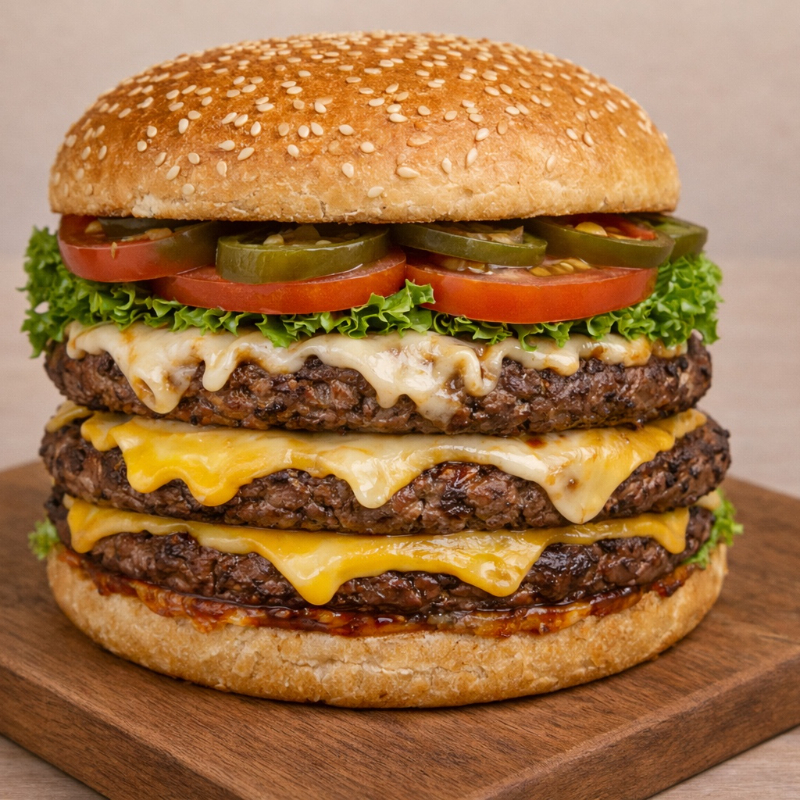 Hamburguesa de 3 Carnes (300 gramos), Doble Queso (60 gramos), en Pan con Mayonesa, Cátsup, Mostaza, Lechuga, Jitomate y Picante.