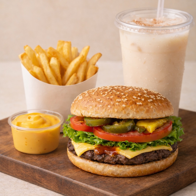 1 Hamburguesa, 1 Snack ó Postre y 1 Bebida.