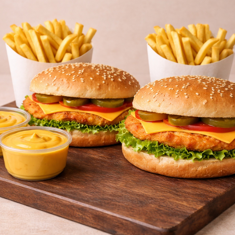 2 Hamburguesas de Pollo y 2 Papas Chicas (200 gramos).
