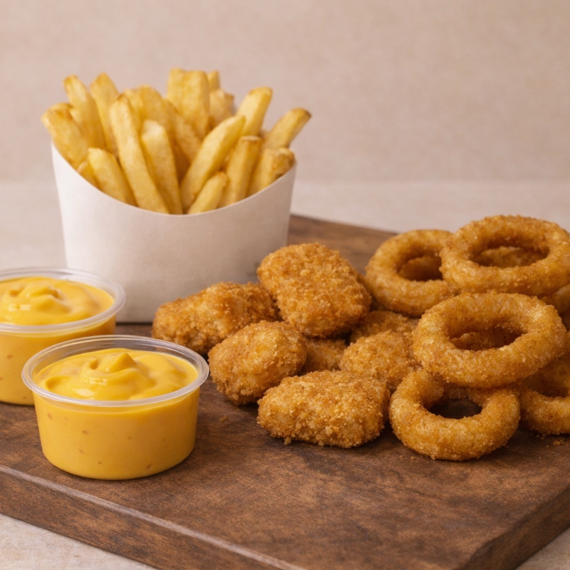 7 Nuggets con 200 Gramos de Papas a la Francesa. Incluye 2 Onzas de Queso Liquido.