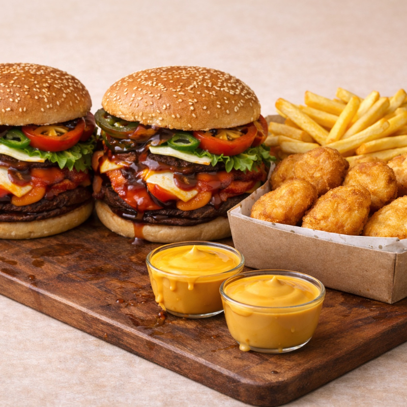 2 Hamburguesas de 2 carnes (200 gramos), 1 porción de pollo (60 gramos), salsa bbq, salsa de alitas y salchicha gratinada (100 gramos). y 7 Nuggets con Papas.