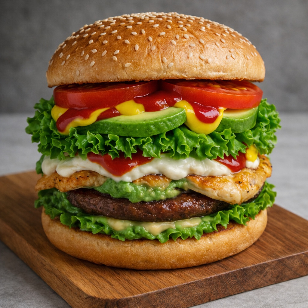 Hamburguesa preparada con 1 carne (100 gramos), 1 porción de pollo (60 gramos), mayonesa-guacamole, aguacate y queso philadelphia.
