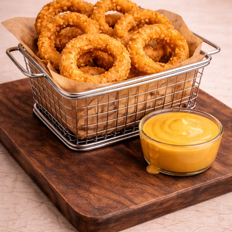10 Aros de Cebolla. Incluye 2 Onzas de Queso Liquido.