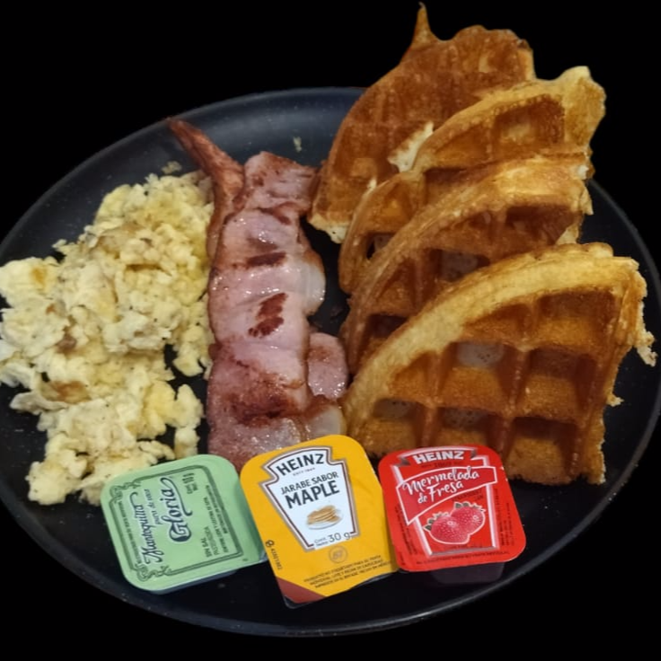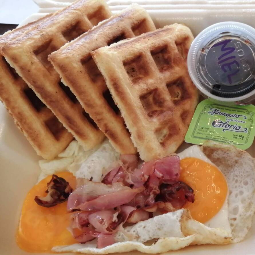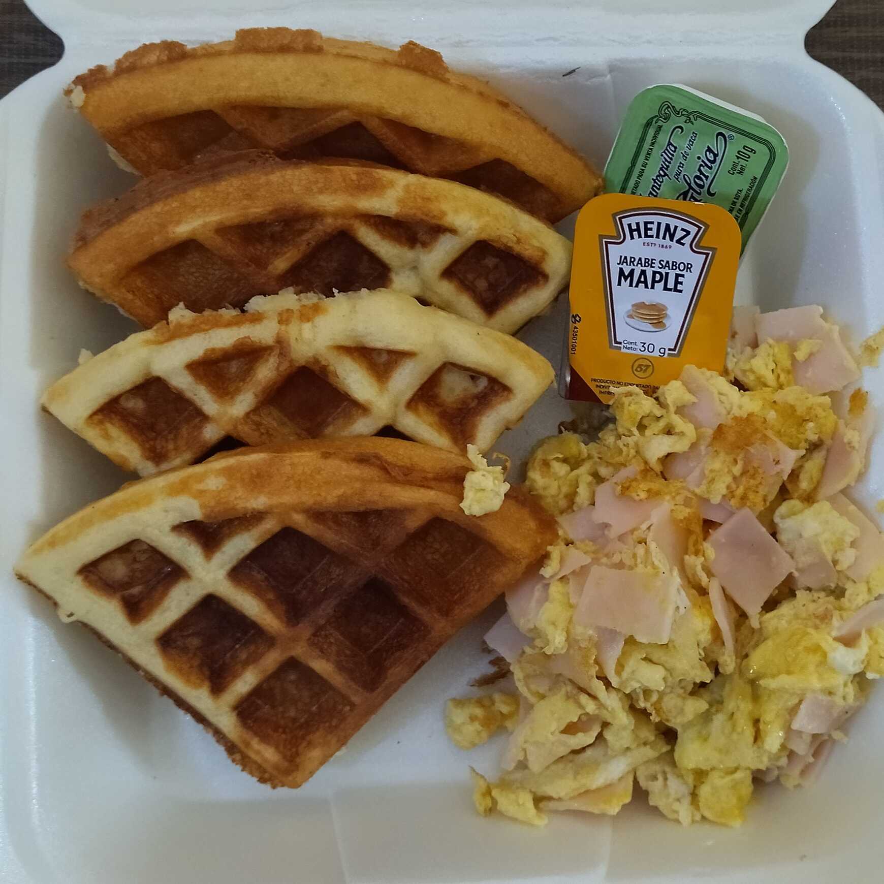 Waffle dividido en 4 porciones acompañado con huevo revuelto con jamón. Incluye miel maple y mantequilla.