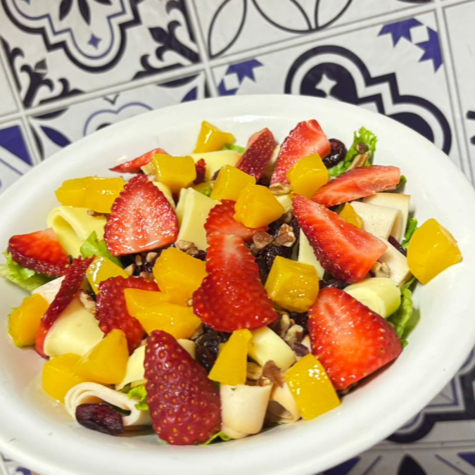 la base es un mix de hojas verdes, jamón de pavo, manchego, durazno en almibar, fresas, arándanos, nuez, pepino, gérmen, crotones, y aderezo.
