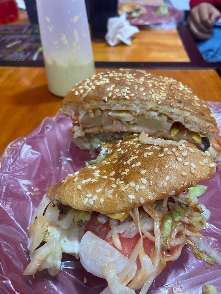 Hamburguesa con jamón, queso y otros ingredientes clásicos.
