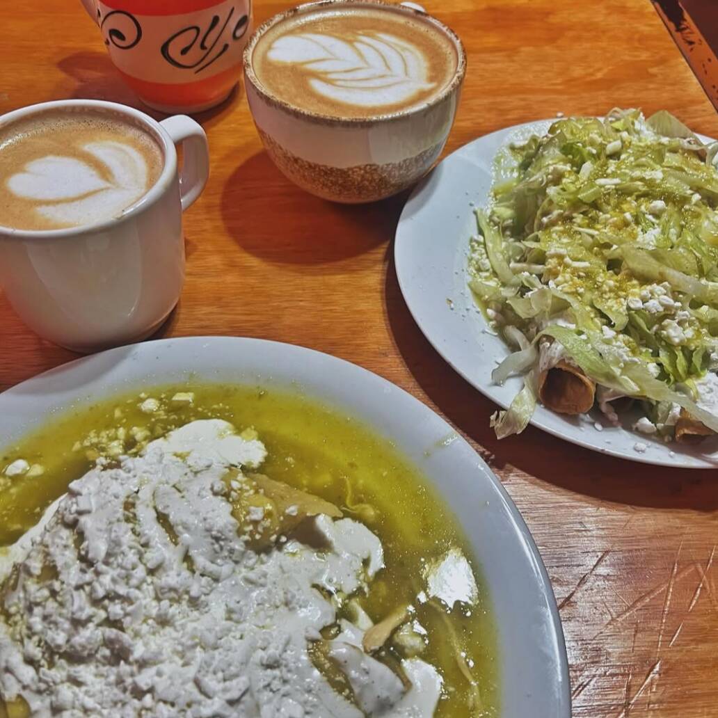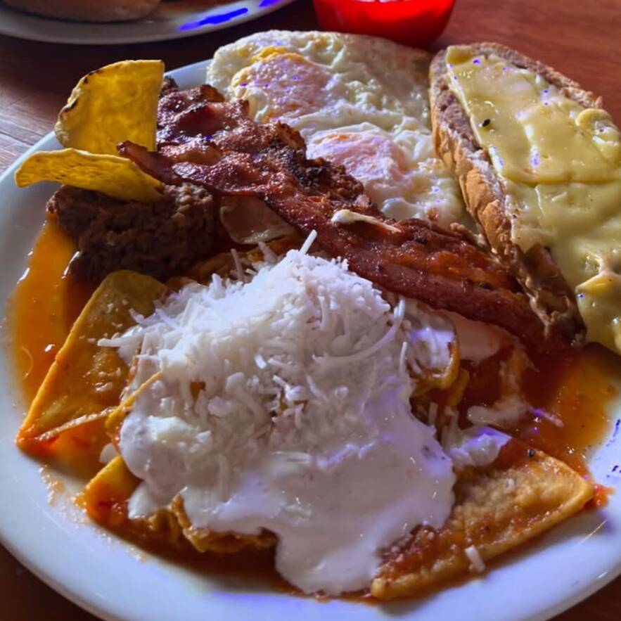 Chilaquiles con salsa verde, roja o mole, y opciones como costilla, aguja norteña, pechuga asada o milanesa de pollo.
