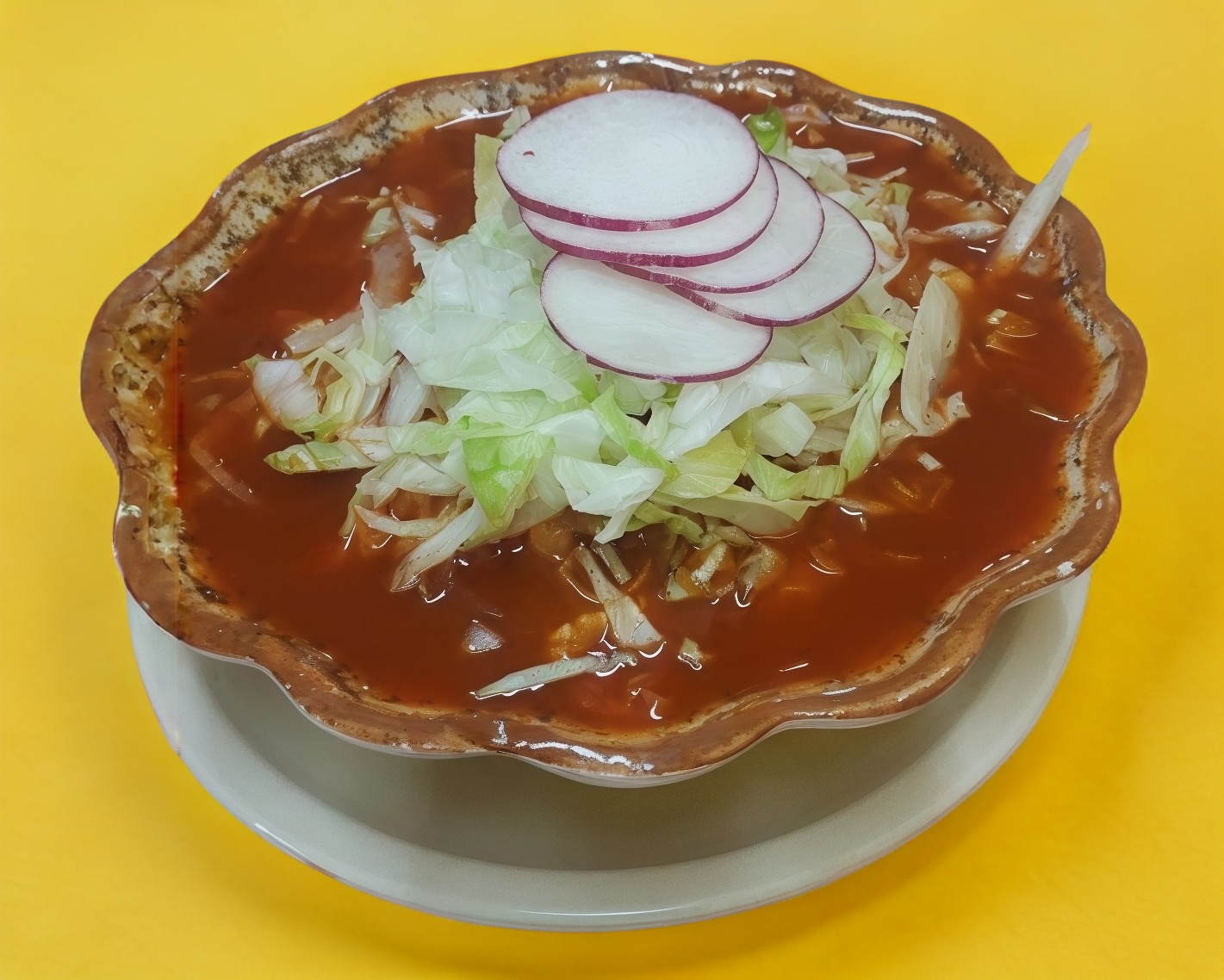 Caldo tradicional mexicano elaborado a base de maíz nixtamalizado, acompañado con lechuga, rábano, cebolla y carne. El caldo es rojo, acompañado de 4 tostadas, limón y salsa tradicional.