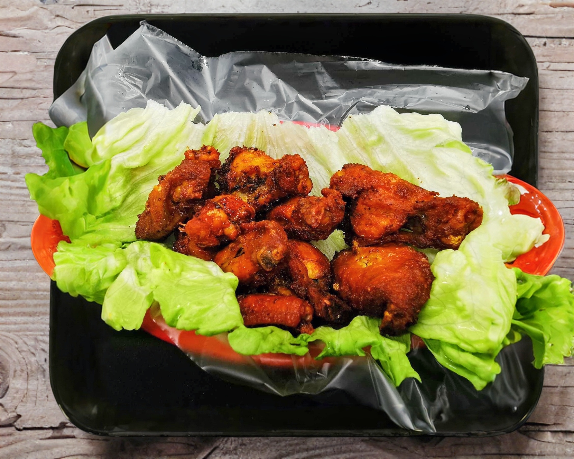 Alitas de pollo fresco acompañadas de salsa BBQ, espolvoreadas con tajín, limón y un sobre de salsa valentina.