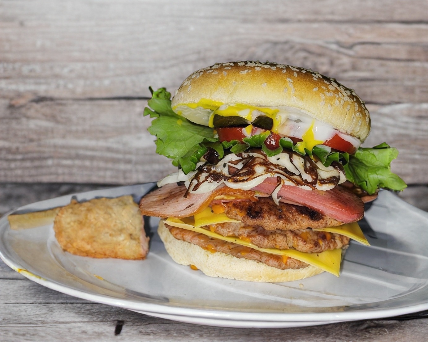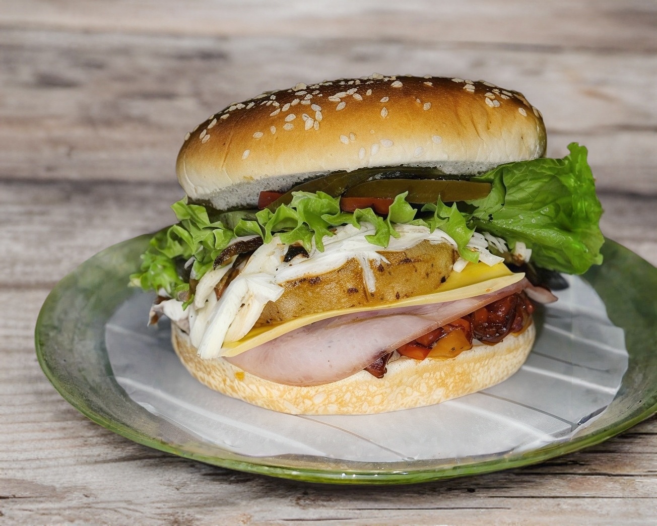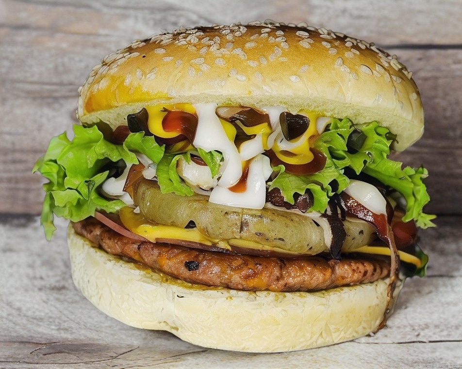 Pan, doble carne molida de res de 80 gramos cada una, jamón, queso amarillo, queso oaxaca, salchicha, lechuga, jitomate, pepinillos, chiles, cátsup, mostaza y mayonesa.