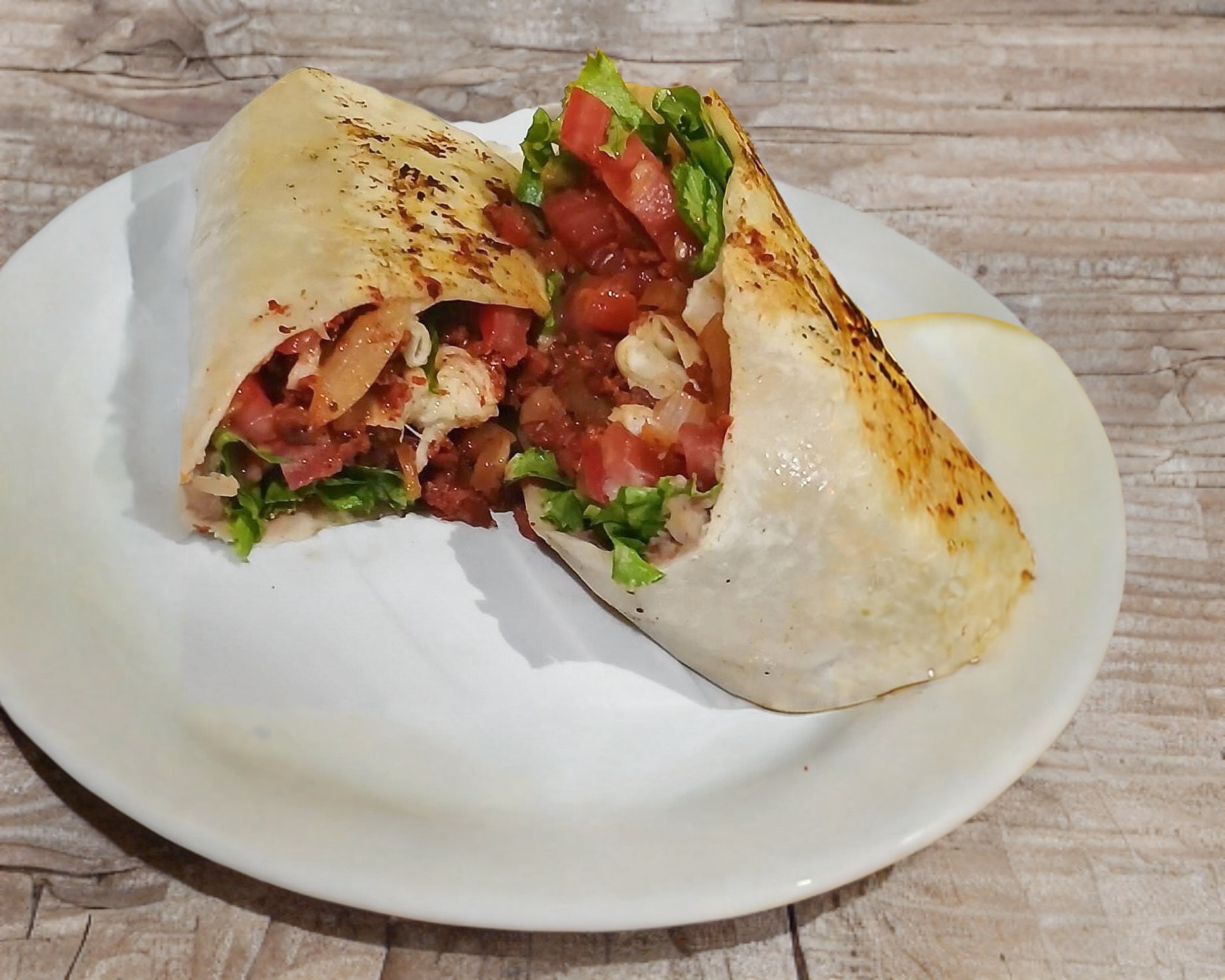 Tortilla de harina de 20 cm, carne de res con cebolla caramelizada, frijoles, lechuga, jitomate, salsa y limón.