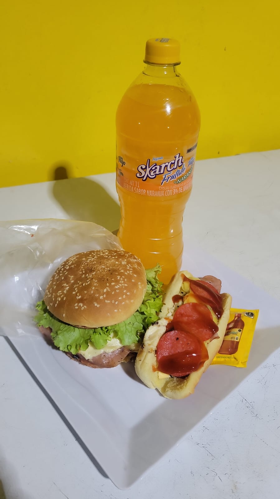 Hamburguesa de tres quesos, un Hot Dog Italiano y un litro de agua de sabor embotellada. El sabor puede variar al de la imagen.