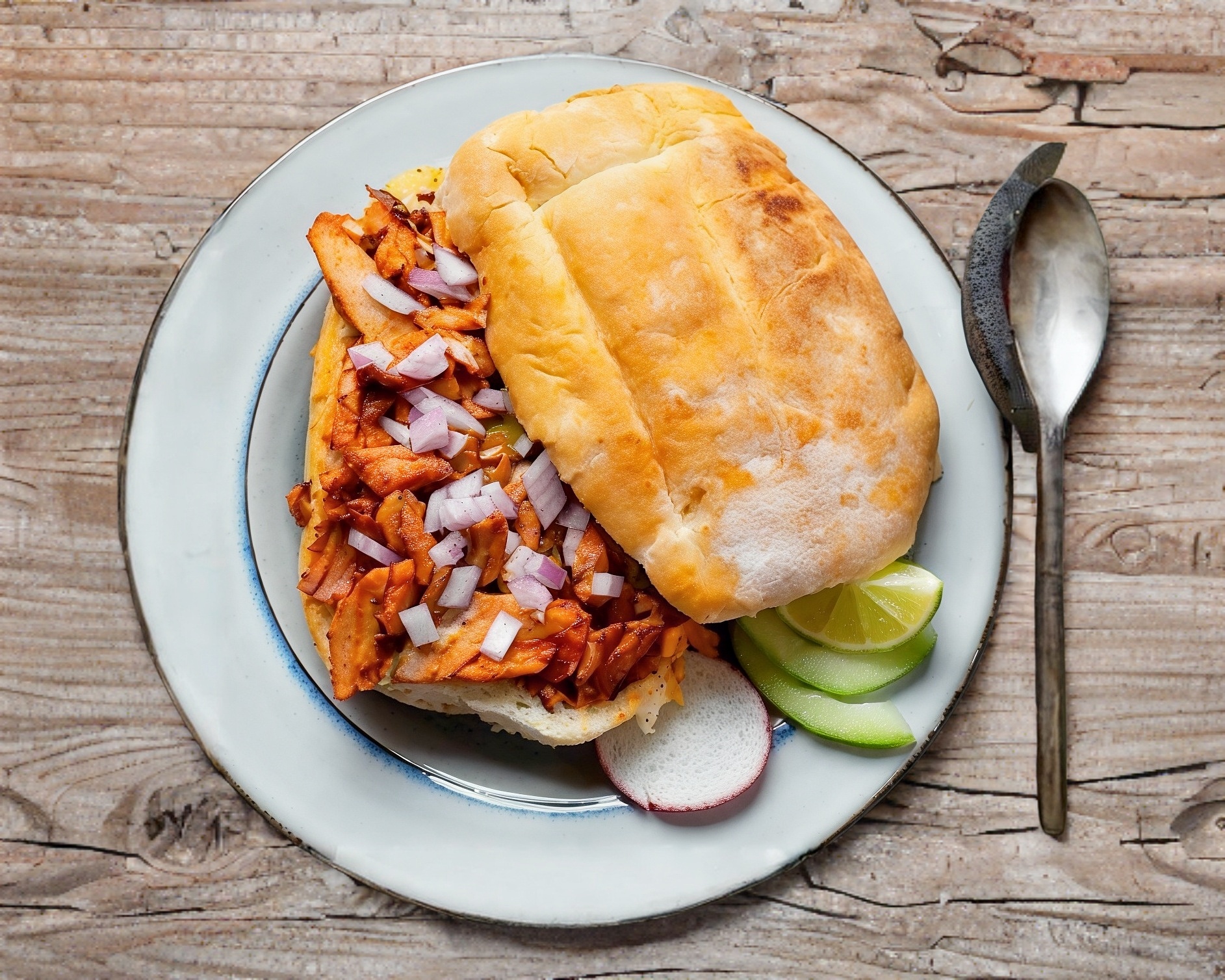 Bolillo untado con frijoles refritos, suadero, papas a la francesa, salsa y limón.