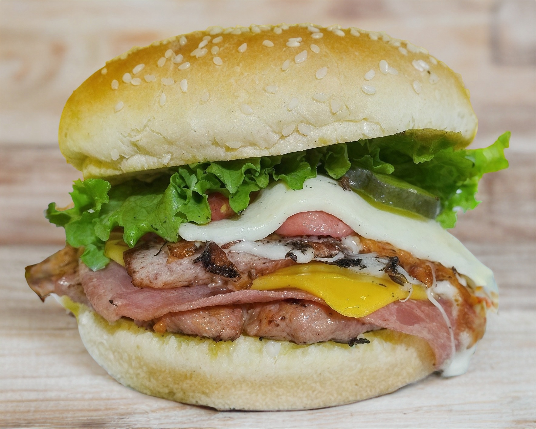Pan, tres carnes molida de res de 80 gramos, jamón, queso amarillo, queso oaxaca, salchicha, lechuga, jitomate, pepinillos, picante, cátsup, mostaza, y mayonesa.