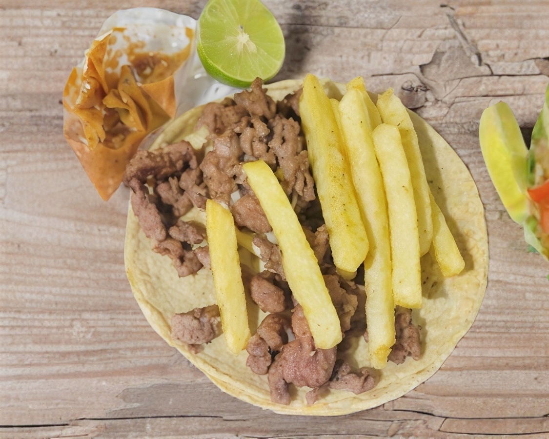 Tortilla de maíz del número 16, carne enchilada, papas a la francesa, salsa y limón.