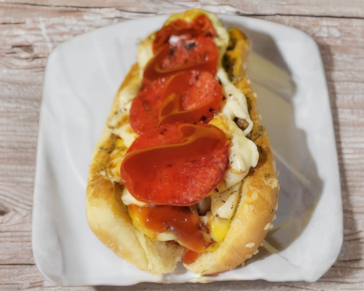 Pan, salchicha de pavo, jitomate, cebolla, picante, mostaza, mayonesa, cátsup