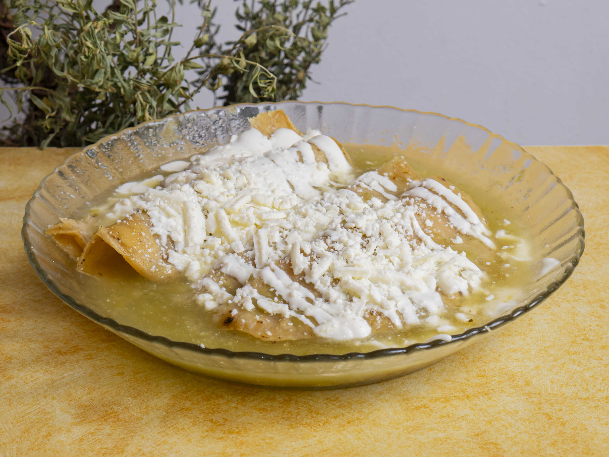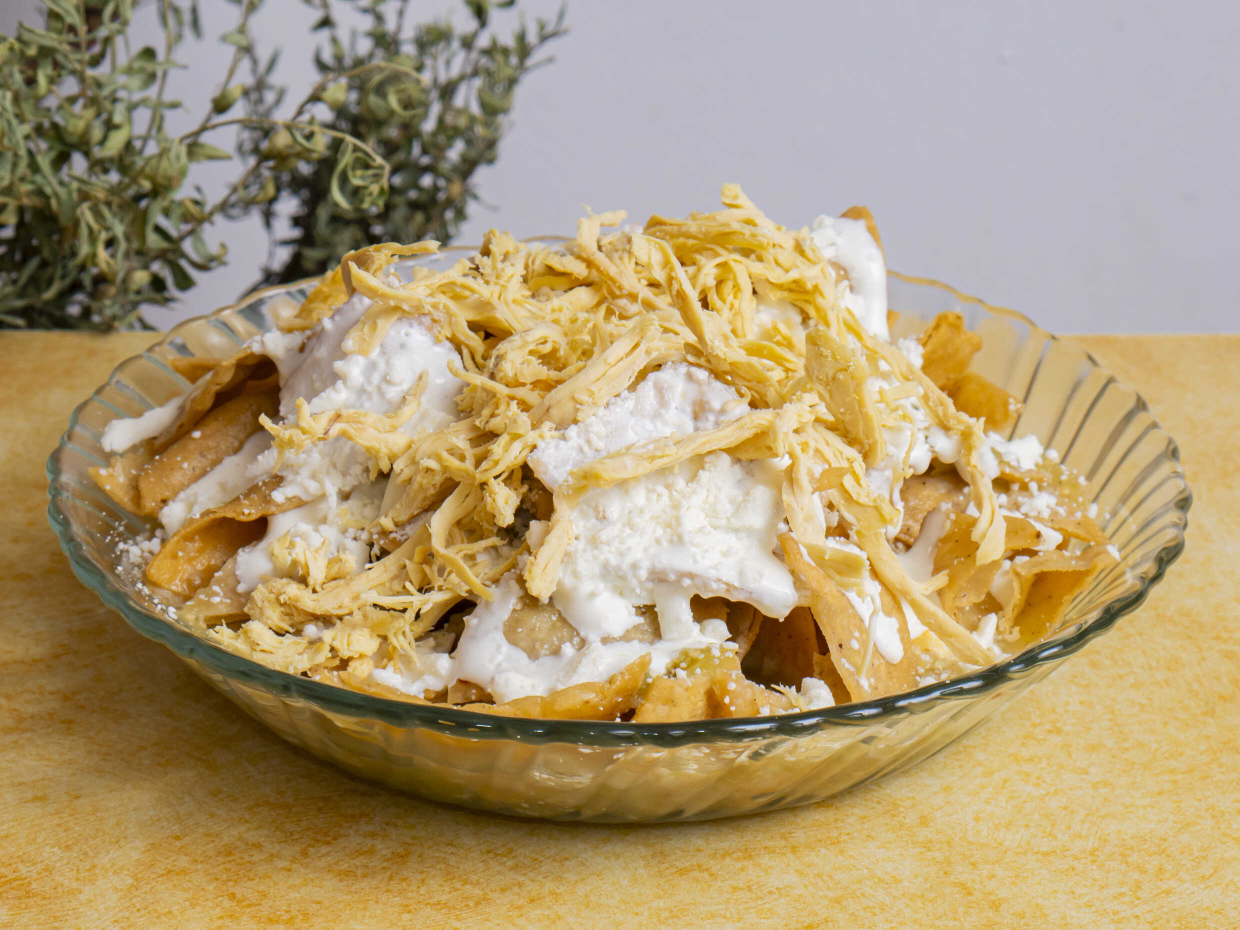 Chilaquiles con crema, queso y pan (bolillo). Plato personal