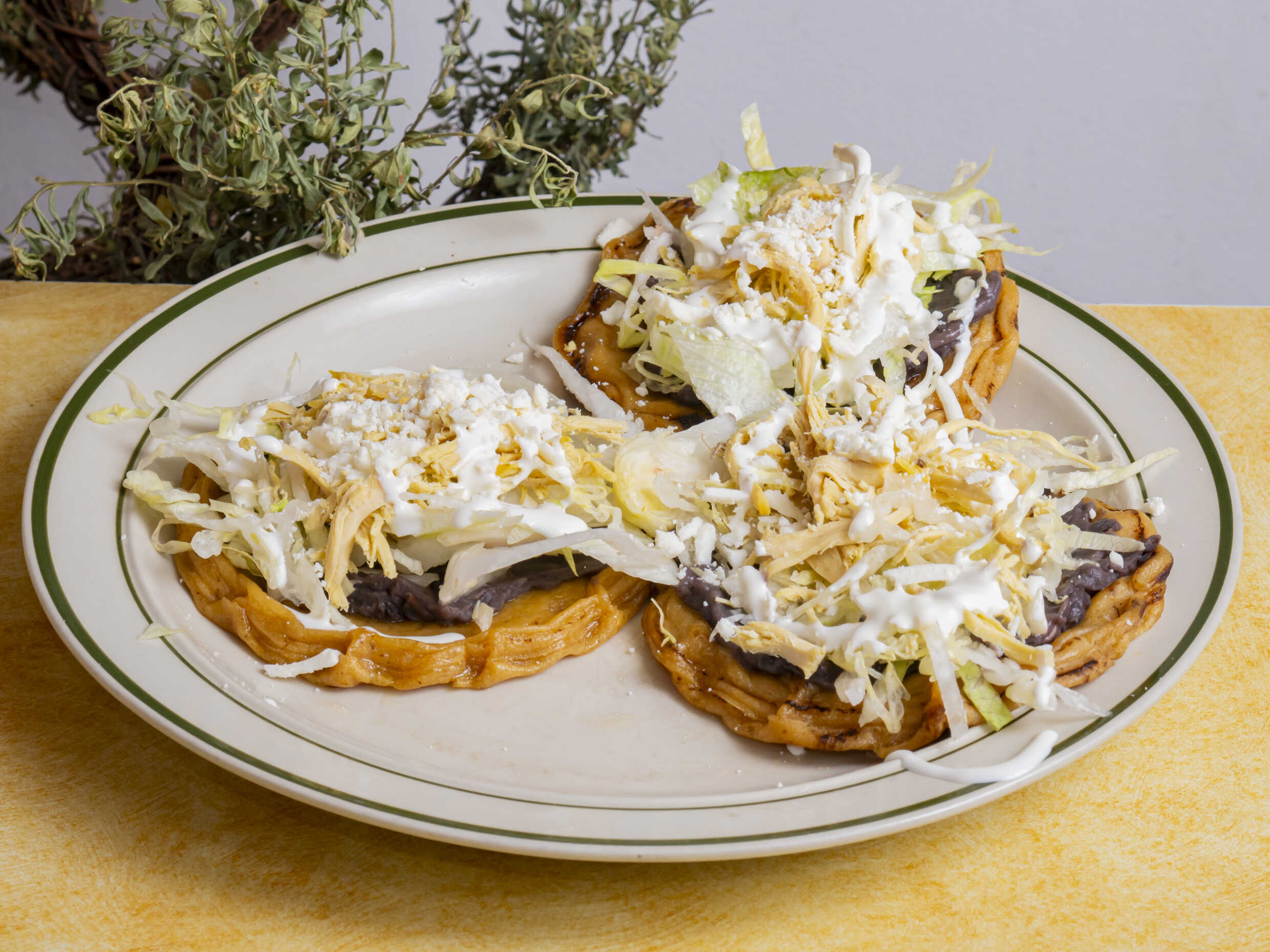2 piezas de sopes con Pollo, queso, crema, lechuga y salsa.